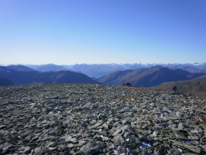 Ser mot fjella kring Sunnylvsfjorden eit stykke borte og litt til venstre i bildet. Til høgre i bakgrunnen m.a. Skruven, Smørskredtindane, Jakta, Slogen, Brekketindane og Regndalstindane.