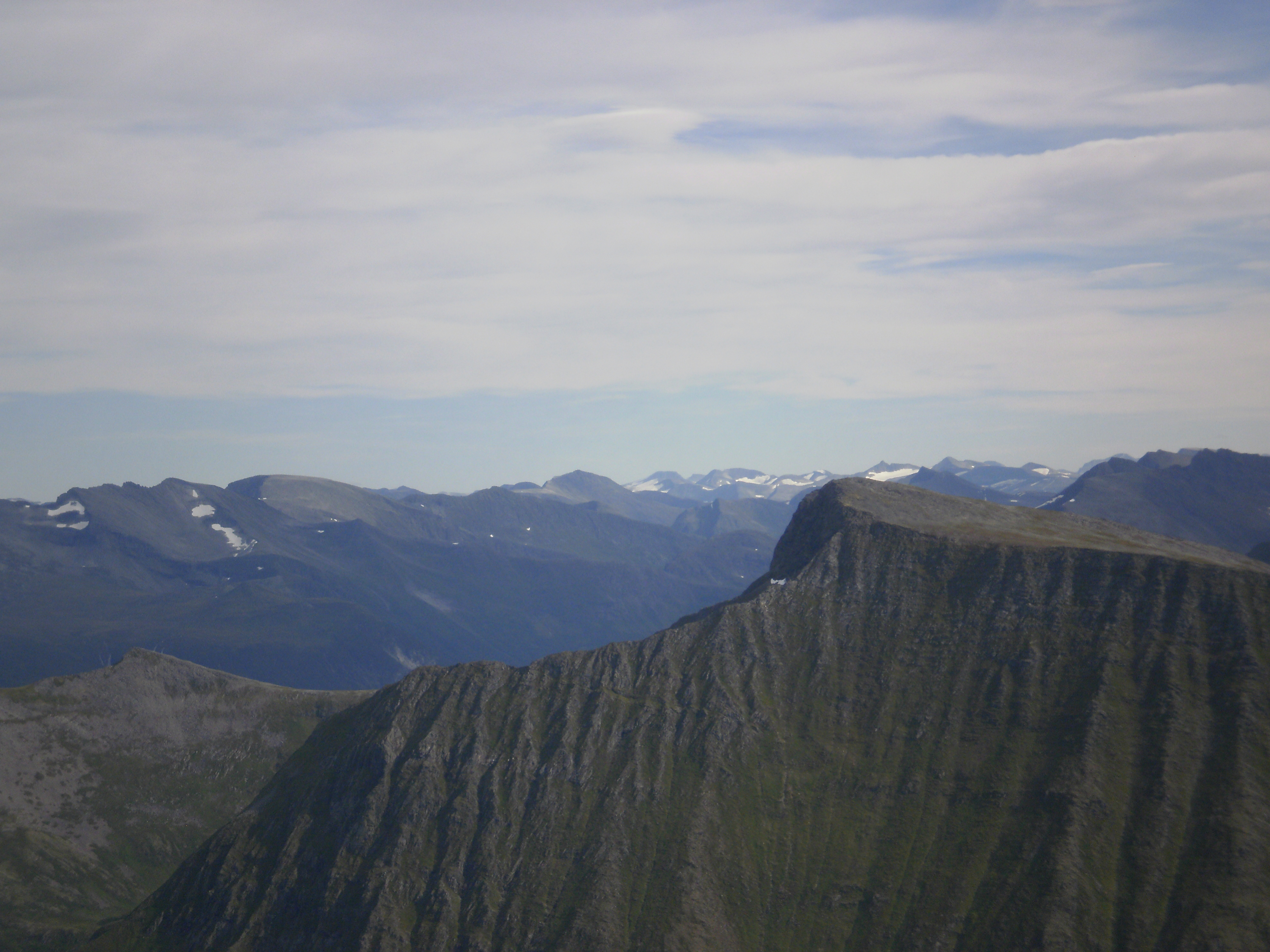 Ser søraustover. Zoomar inn. Sprovstinden er nær. Langt inne ligg Pyttegga, Karitinden og Illstigfjellet til venstre for Sprovstinden, og Trollkyrkja, Muldalsegga og Svartegga til høgre.