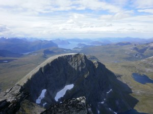 Lauparlægda er det næraste fjellet i vest. Midt i bildet ein del av Storfjorden frå Vaksvika ut til Glomset.