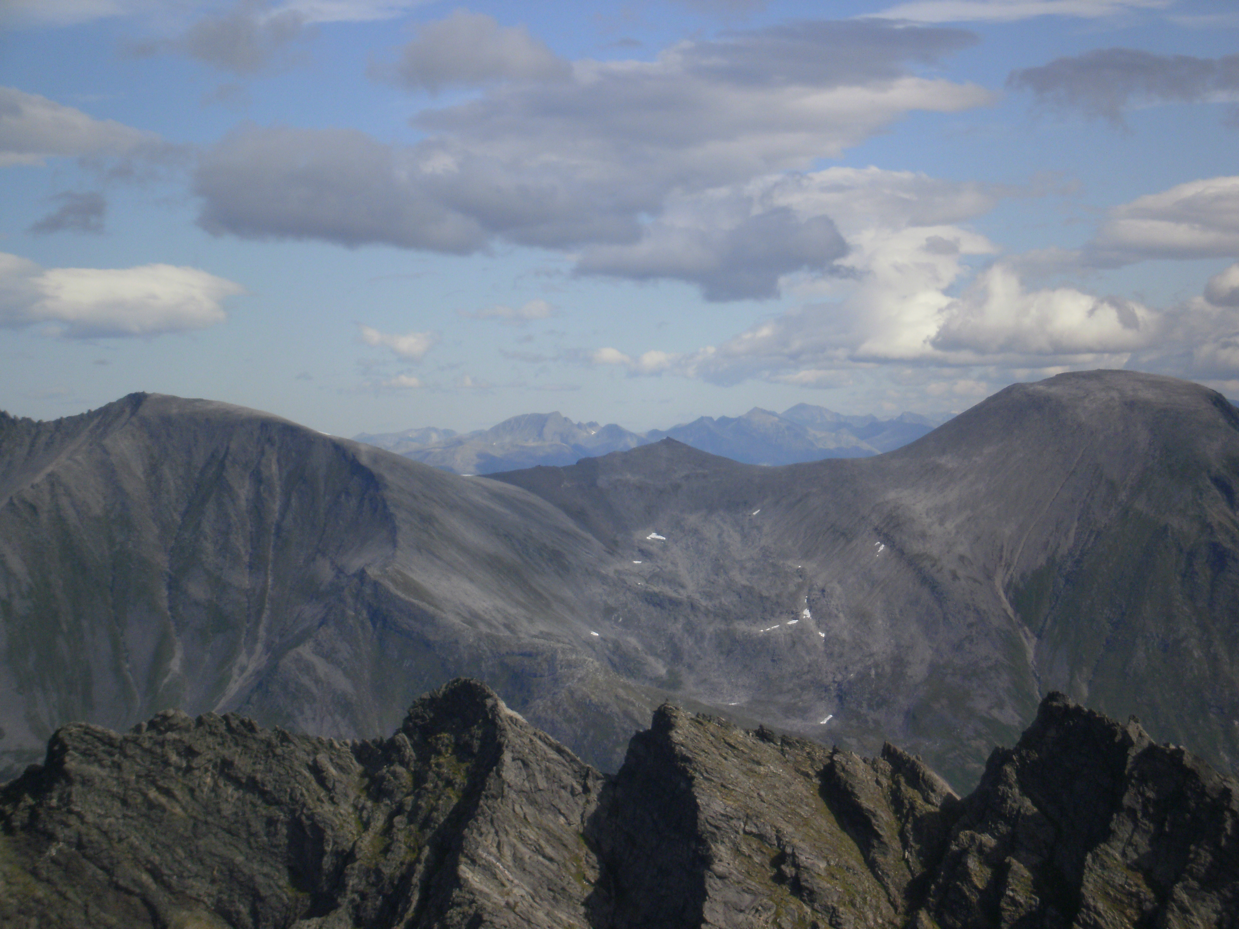 Zooma inn fjell i nordaust. Næraste rada er Brurefølgjet, bortafor ligg Sandfjellet og Storbuen, og langt borte Klauva, Kirketaket, Kjøvskartinden og Skjorta.