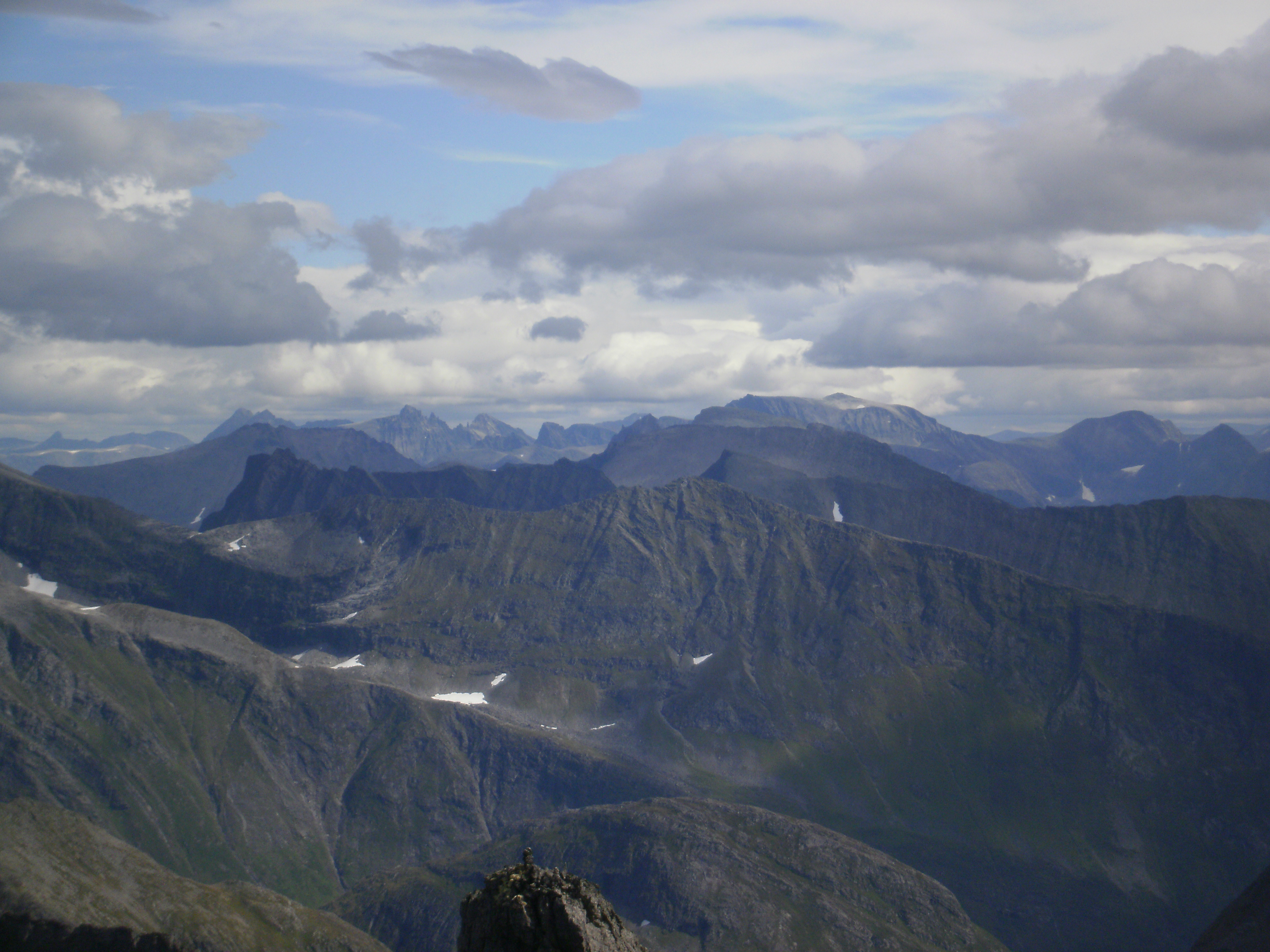 Ser aust-nordaustover mot Vengetindane, Kongen i Isterdalstindane, Trolltindane og Finnan i himmelsjå. Nærare ligg Skjervan og enda nærare Trollvasstinden på rett line mot Vengetindane. Til høgre for desse ligg Lissjevasstinden ikkje langt borte, og bak denne stikk Nonstinden og Middagstinden opp. Heilt til venstre nokre fjell på vestsida av Eikesdalsvatnet langt borte.