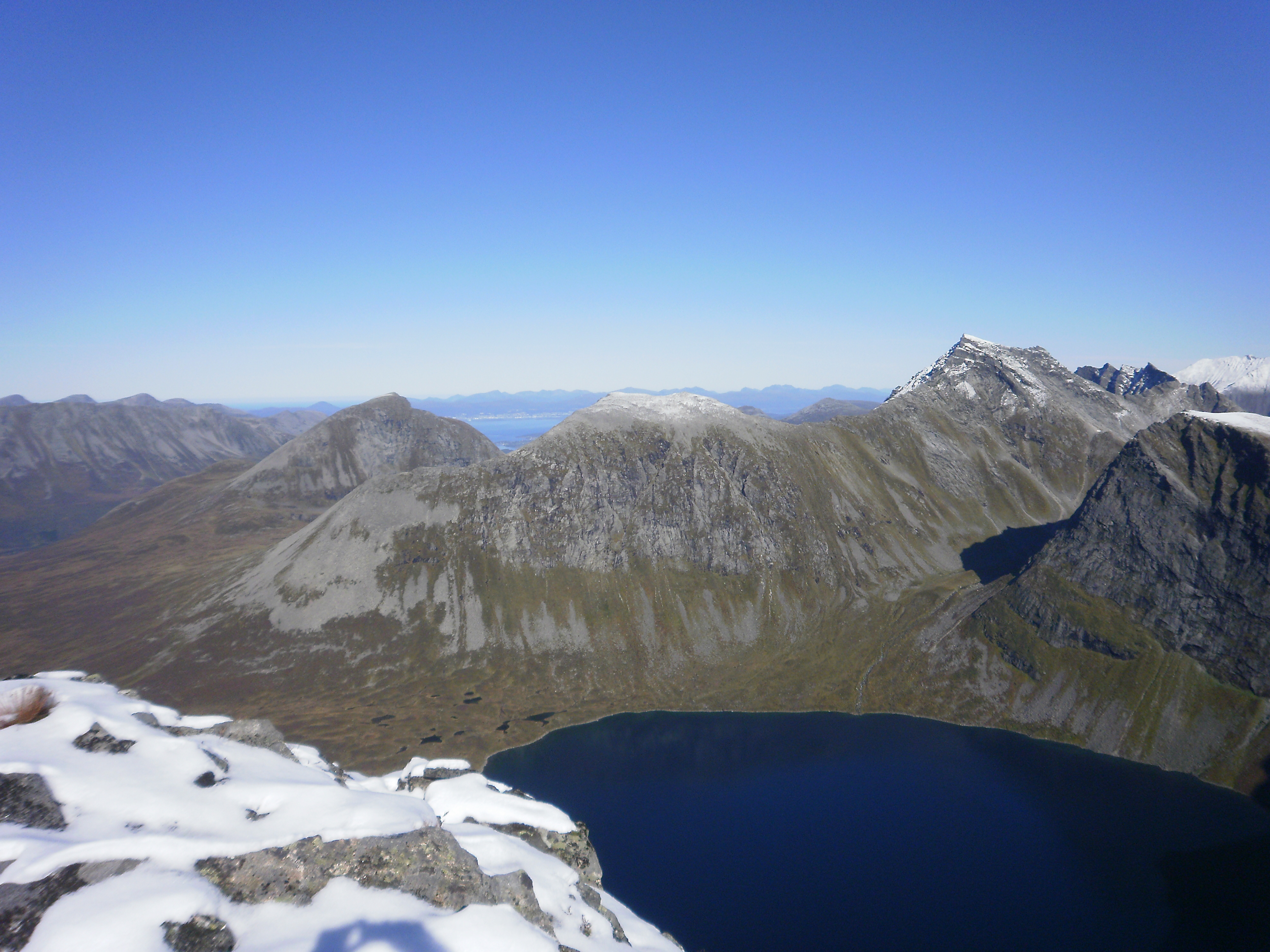 Ser ned på Grytavatnet med Lauparlægda bakom i midten, og Lauperen og Brurefølgjet til høgre. Kvitnykja litt til venstre. Lengre bak til venstre ligg Næremstindane, og bakom dei ligg Brustinden, Ytstetinden og Remmemstinden på ei rad. Bakom ligg Romsdalsfjorden, og langt borte fjella mellom Molde, Fræna, Eide og Gjemnes.
