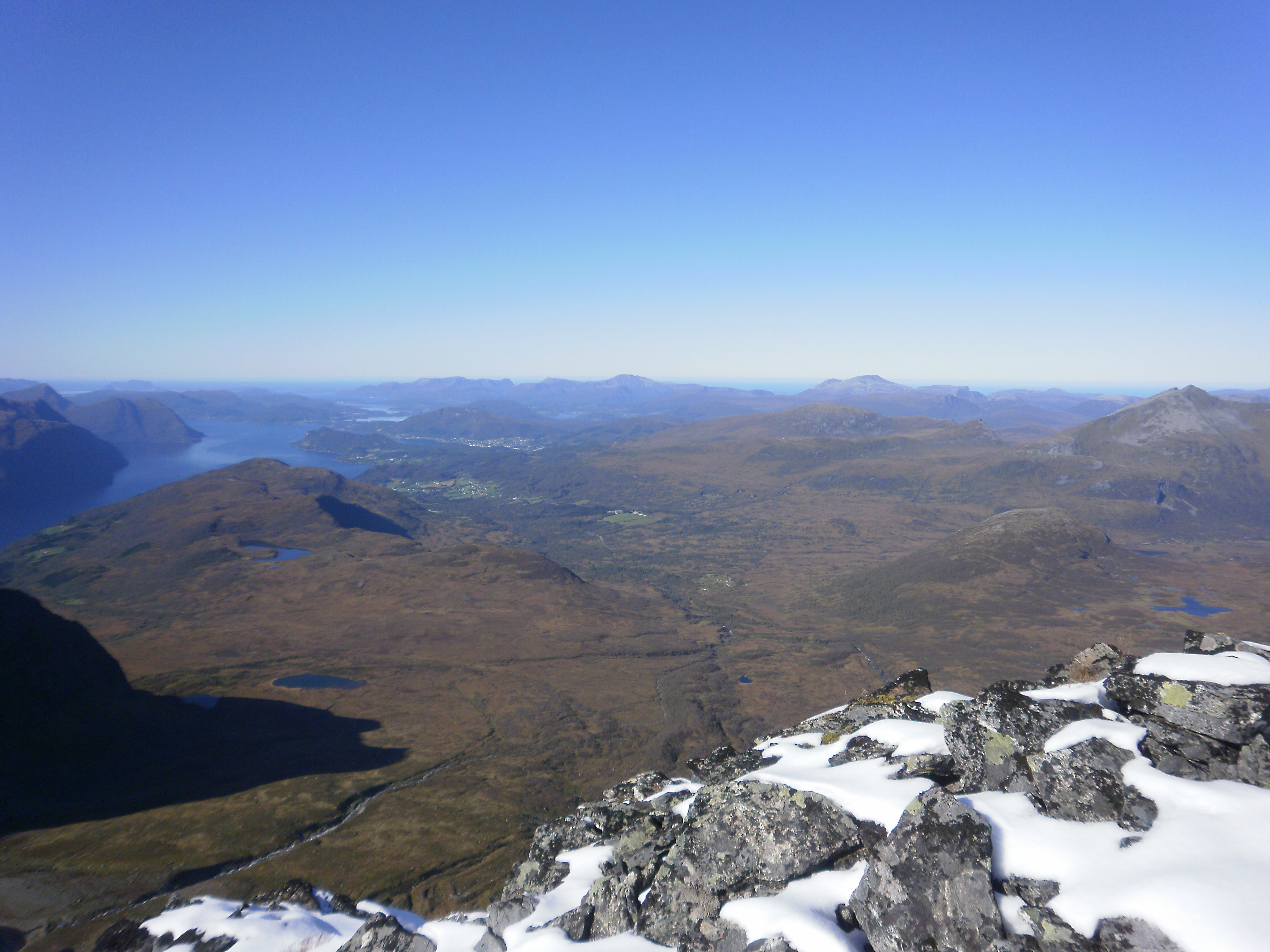 Ser utover mot vest. Det lave fjellet som teiknar horisont mot Storfjorden er Hallvardfjellet. Til høgre viser busetnaden i Vaksvika, Skarbøen og Ørskog som lysegrøne flekkar. Langt ute stikk Godøya opp heilt til venstre, vidare mot høgre ligg Gamlemsveten, Storfjellet og Blåskjerdingen. Heilt til høgre og ikkje så langt ute ligg Høgsvora.