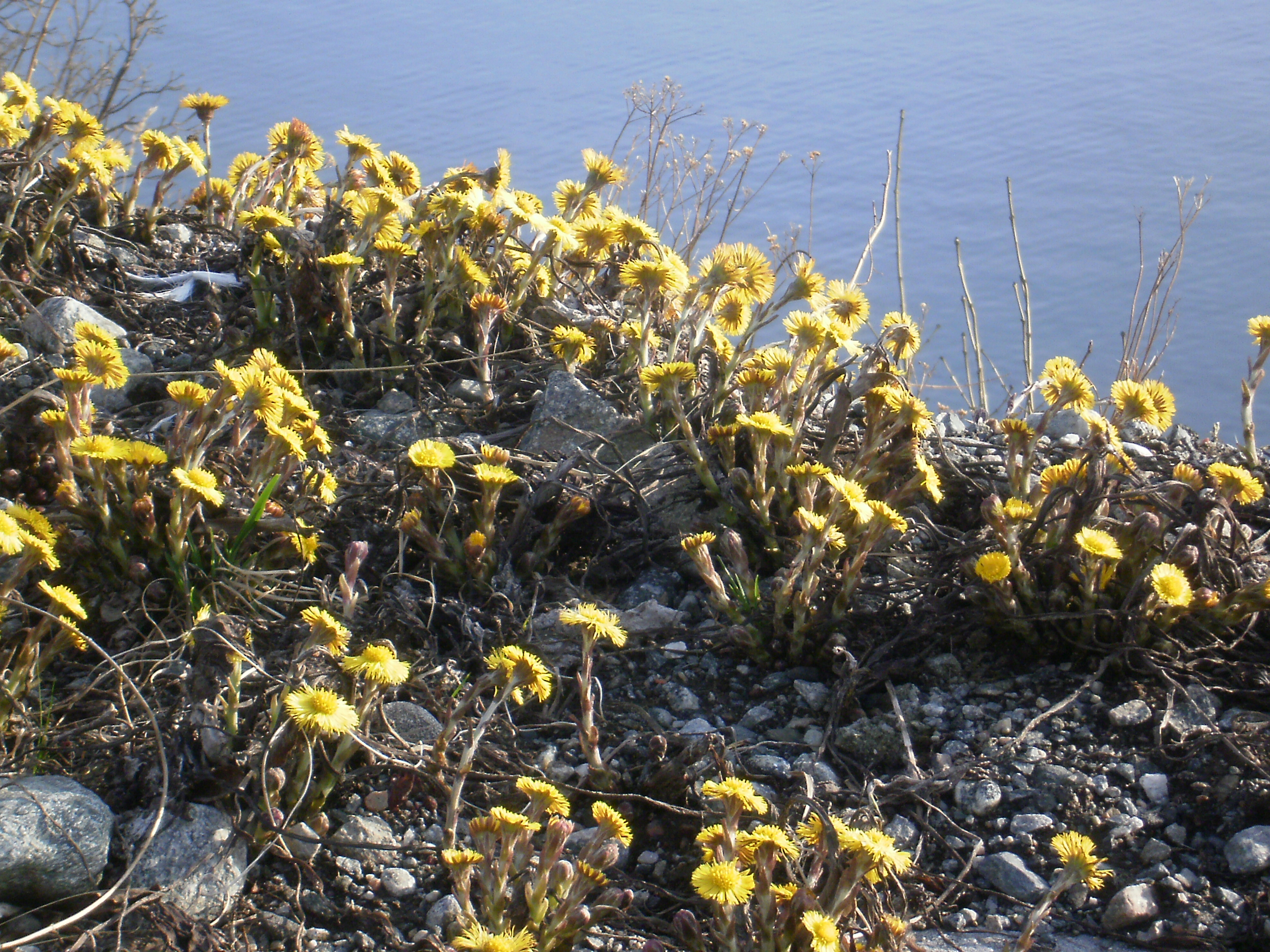 Massevis med hestehov like ved riksvegen på Kleivaneset. Her er nokre av dei med sjøen som bakgrunn.