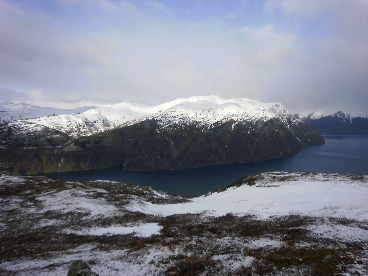 Ein kald morgon på toppen. Frisk bris frå sør-sørvest, kring null grader. Snøpartia er harde og faste å gå på. Ser over fjorden mot Storfjellet som ligg i solskin i augneblinken.