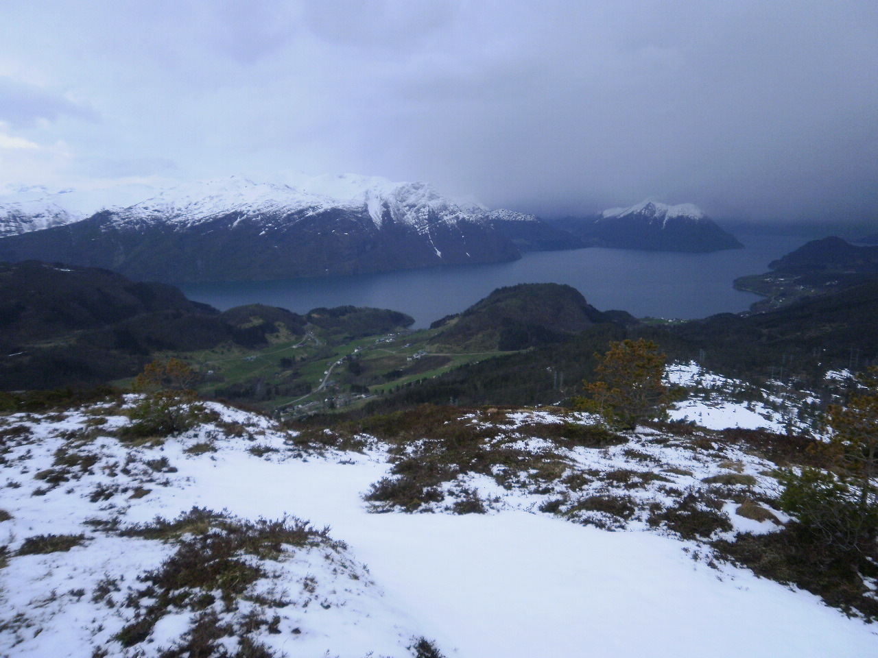 Ser vestover frå Grønnykjen/Grynykjen. Ein kjølig kveld med nordvest svak vind her oppe. Turen opp gjekk for det meste på berr mark, nokre små snøparti å passere på slutten.