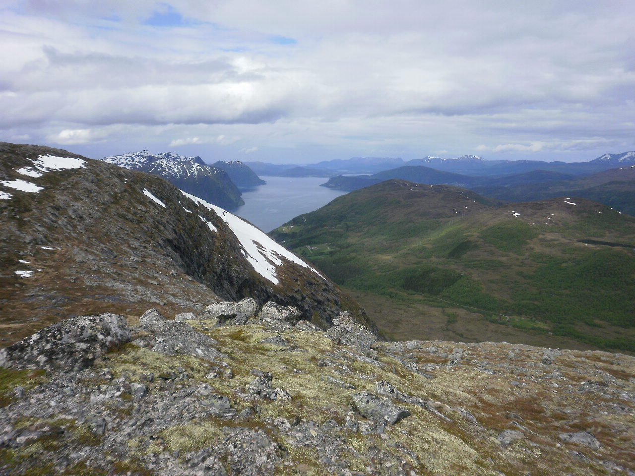 Ser ned på Gjerdsstølen til høgre, Bolleberget og Halvardsfjellet bortafor, og Storfjorden midt i bildet.
