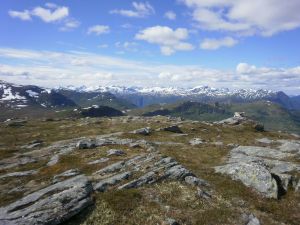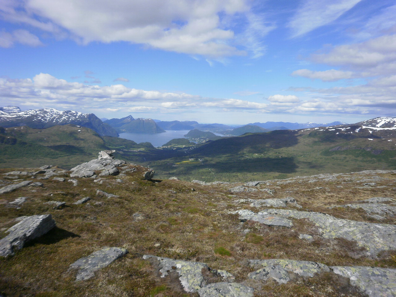 Tre første bilda er frå toppen av Blåfjellet. Sør-søraust laber bris, god temperatur og solskin oppå fjellet denne dagen. Første bildet mot Grytavasstinden, Storbotnshornet og Fremste og Heimste Skorkja. Andre bildet mot fjella i Stranda og Sykkylven. Tredje bildet mot Storfjorden. Fjerde bildet viser Kvitnykja frå området ved Heivatna.