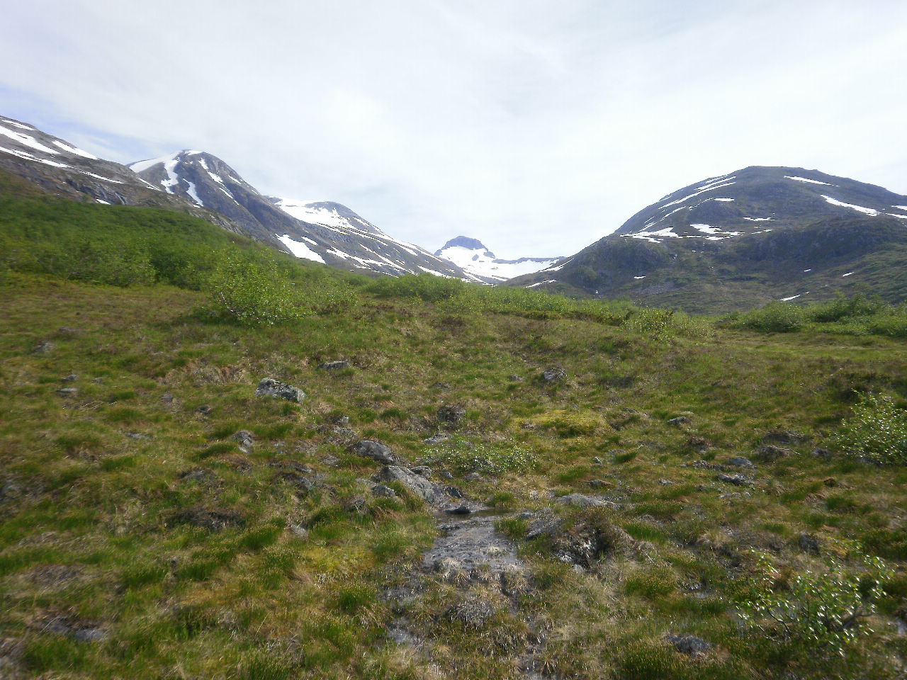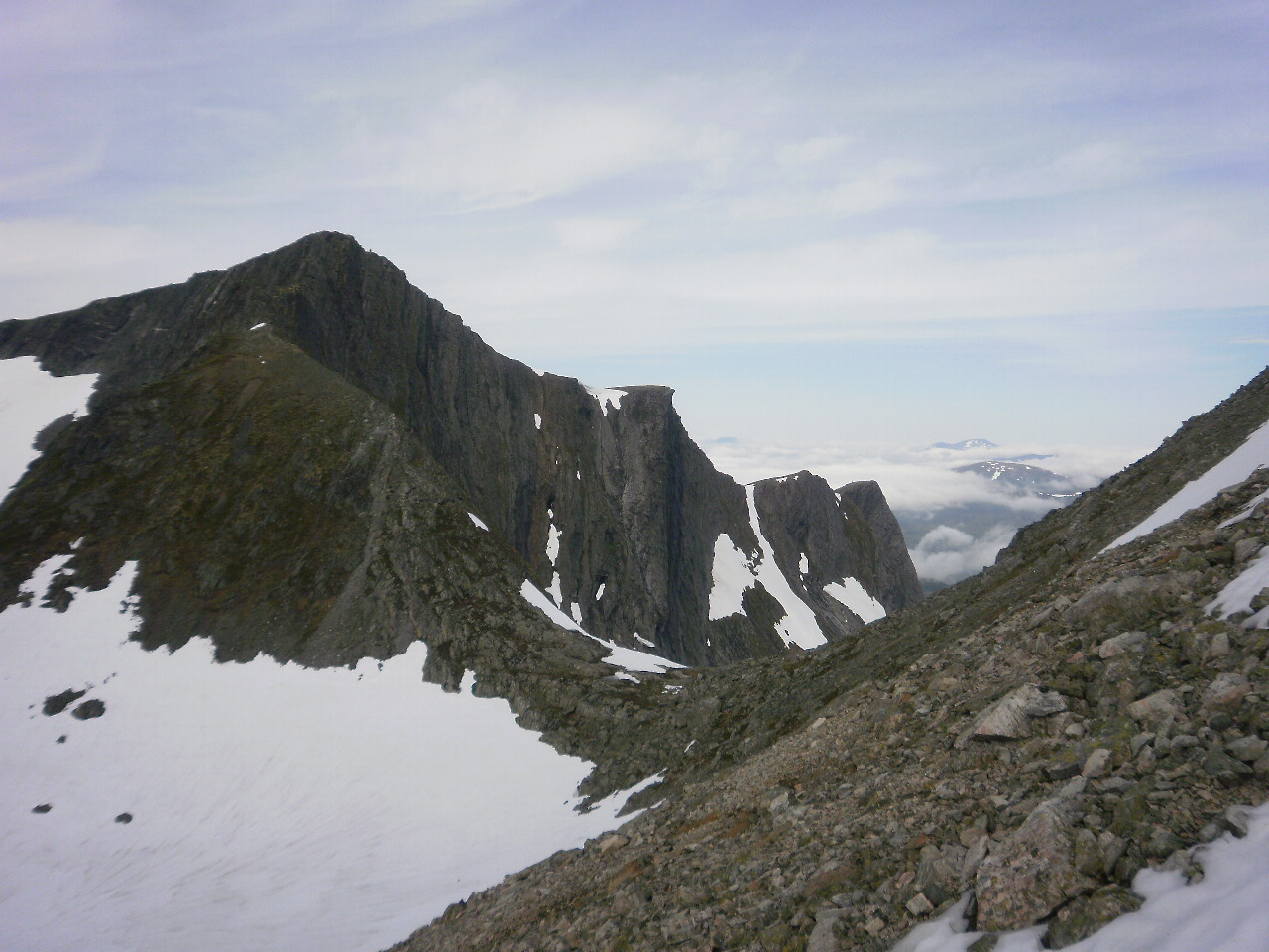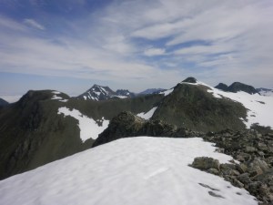 Bilde 1: Ser opp mot vesttoppen på Storbotnshornet beint i mot og inn for enden av dalen. Sandegga oppe til venstre. Bilde 2: Sandfjellet (Heimste Skorkja) sett frå aust. Ruta over Sandegga går opp frå skaret og mot høgre. Bilde 3: Fremste Skorkja til venstre og høgaste Sandegga og dei to toppane på Storbotnshornet til høgre. Bakom stikk Lauparen og Brudefølgjet opp, og enda lengre bak ligg eit fjell med det velbrukte namnet Sandfjellet aust om Tresfjorden. Bilde 4: Fremste Skorkja bakom varden, og Kvitnykja til venstre for denne. Lengre borte og rekna frå nær til fjernare ligg Høgsvora, Næremstindane, Sprovstinden, Brustinden og Ytstetinden.