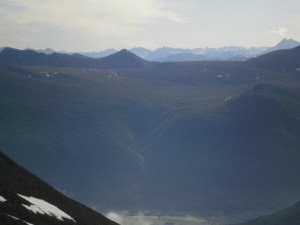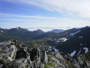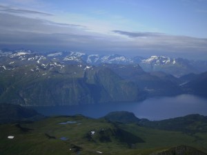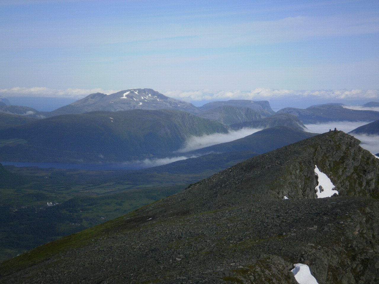 Bilde 1: Ser mot Romsdalsfjorden som her er gøymd under skoddeskyer. Lengre borte ligg fjella nordaust om Molde. Bilde 2: Zoomar nordaustover. Langt borte ligg m.a. Klauva, Kyrkjetaket, Kjøvskardtinden, Sjøvdøla, Juratinden, Vikesoksa, Hoemstinden?, Slotthøan og lengst til høgre Vengetindan. Bilde 3: Ser mot Storfjorden og fjell i Sykkylven frå Råna og utover. Bilde 4: Zoomar Blåskjerdingen.