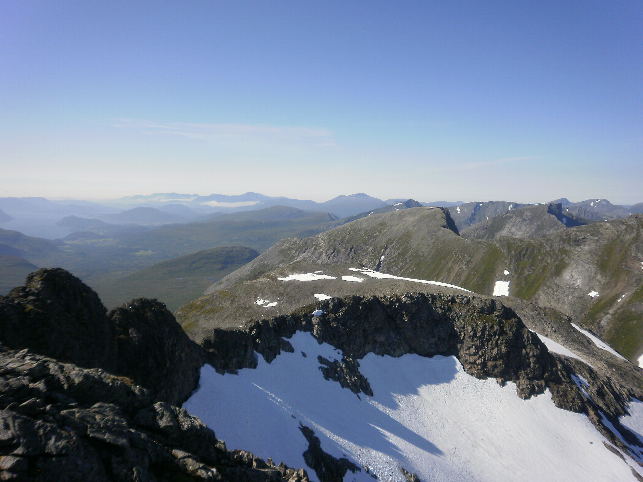 Ser frå Grytavasstinden ut mot Lauparlægda nærast og Kvitnykja til høgre og bakafor. Langt ute ligg Storfjellet til venstre og Blåskjerdingen til høgre.