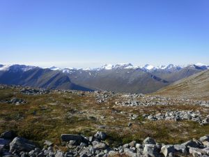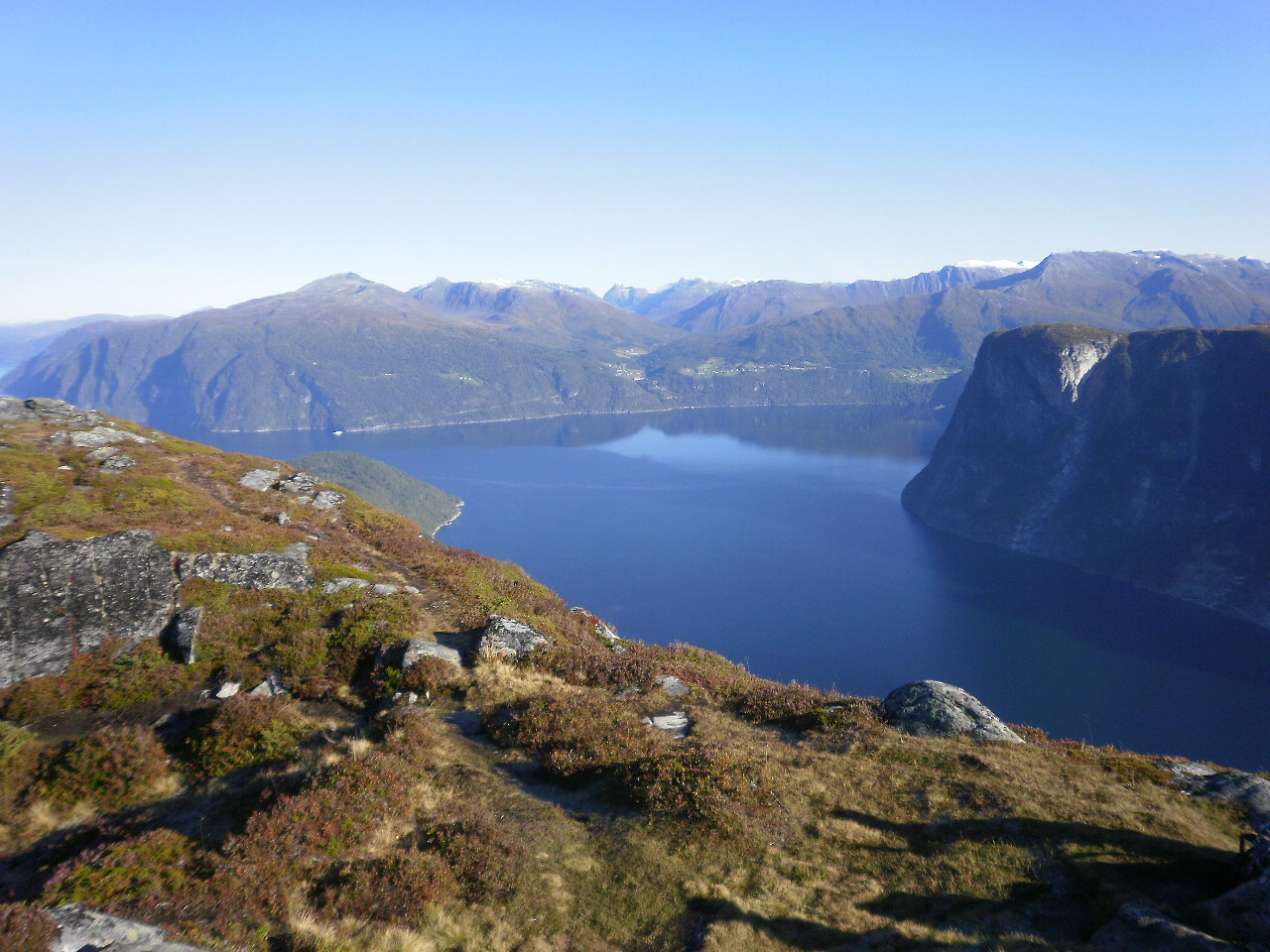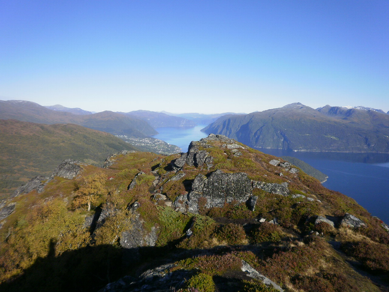 Var på turlagstur 23. september. Komne opp på Lievarden er der eit fint tilbakesyn mot Stranda og Storfjorden på bilde 1. Bilde 2 er teke same staden og viser Skrenakken til høgre, Liabygda midt i bildet og Jolgrøhornet til venstre. Oppe i skaret mellom dei to Blåhorna opnar utsynet seg mot Sunnmørsalpane (bilde 3), med Emdalstindane, Skruven, Risenosa, Jakta, Smørskredtindane, Leirvasshornet, Brekketindane, Vellesæterhornet, Brunstadhornet og Råna. På bilde 4 er Vellesæterhornet, Brunstadhornet og Råna med, og vidare Dalmannshornet og Urdfjellet. Heimste Blåhornet til høgre og mykje nærare.