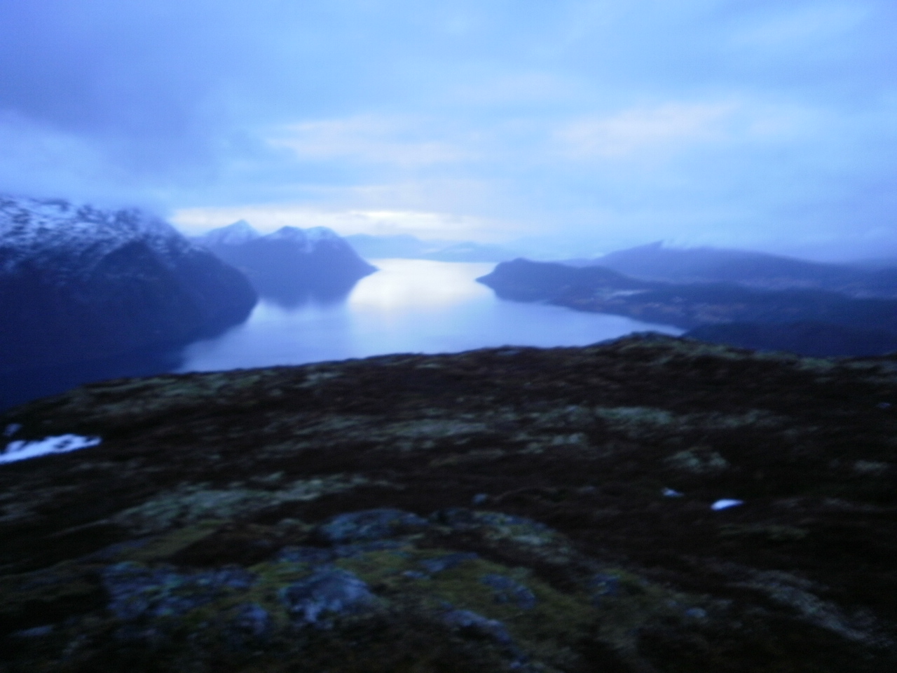 Det byrjar smått å skymest, og er eigentleg mørkare enn det ser ut til på bildet. Grått i vêret, opplett etter ein dag med skoddeskyer og småregn. Det er varmegrader her oppe, vått i krattet og ein svak vind frå sørvest. Gjekk dels på berr mark og dels på snøflekkar på turen opp. Mykje is og tele i marka. Såg seks rjuper på turen, og nokre (to?) granmeiser i skogen.