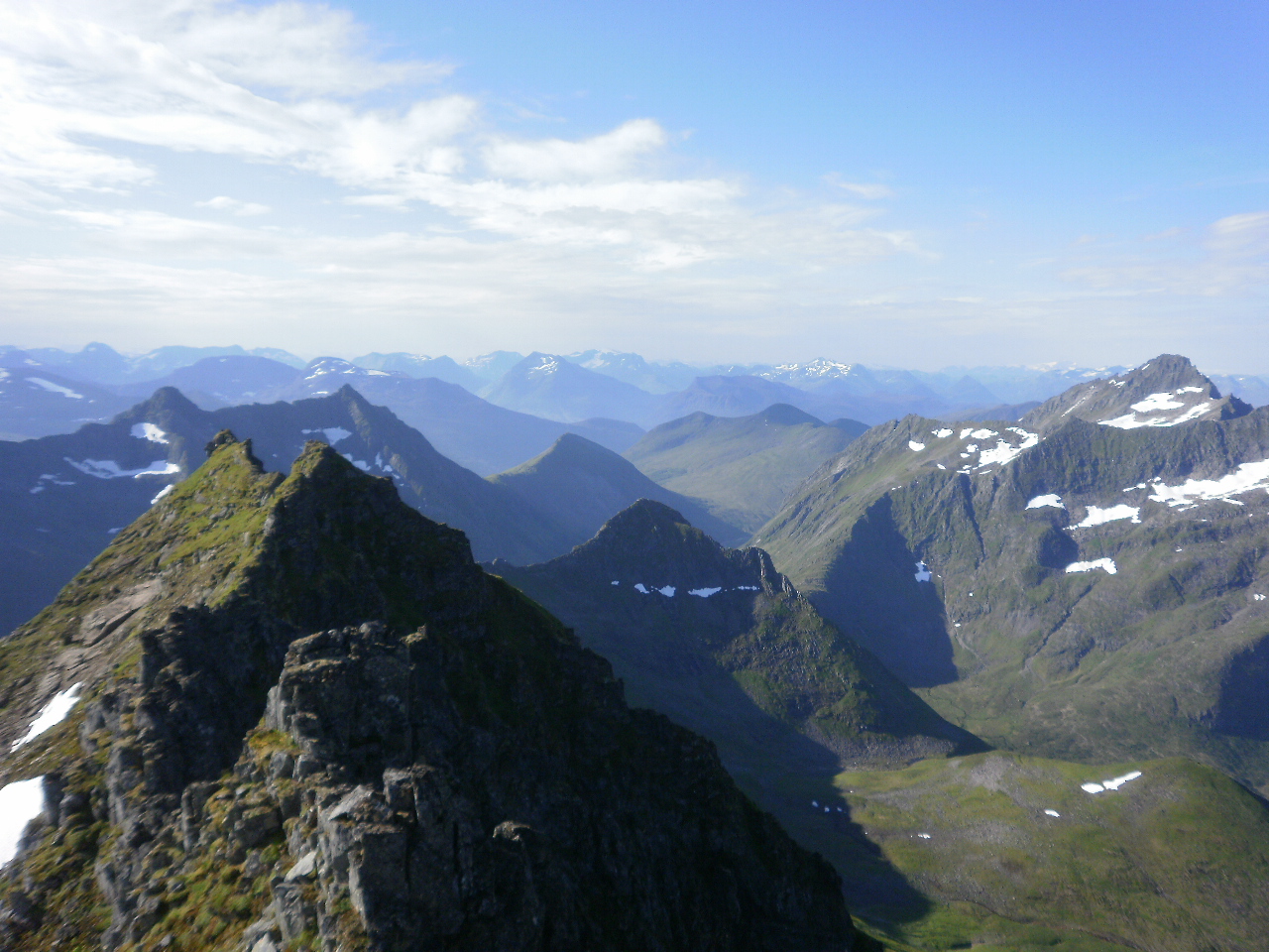 Utsyn mot sør. Kjerringa og Mannen rett bakom søregga på Åvasstinden. Vassdalstinden til høgre. Sørsøraust svak vind og varmt i lufta med ein lett dis denne dagen.