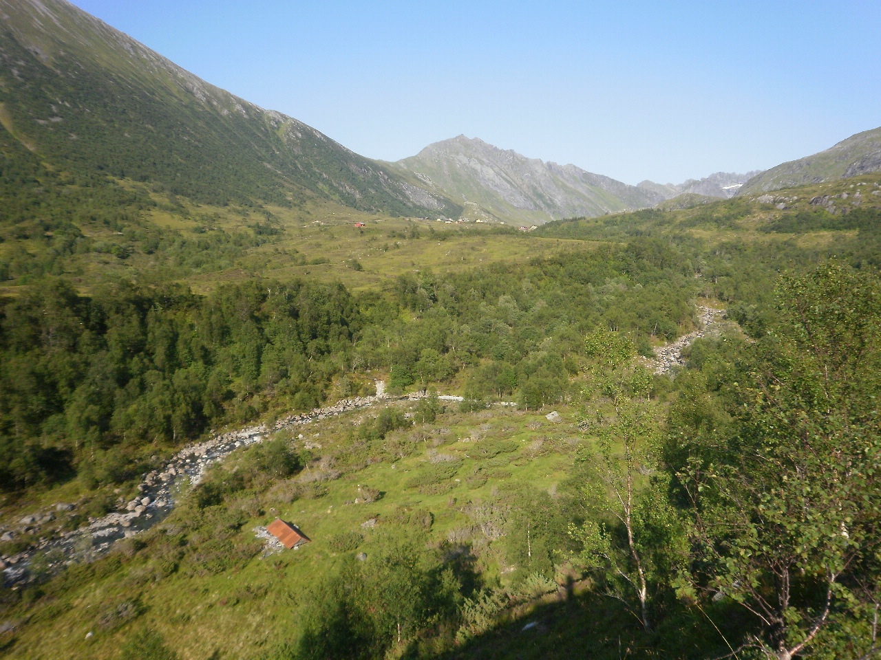 Restane av Årskogsætra nedunder bakken. Høgebakken og Middagshornet i bakgrunnen.
