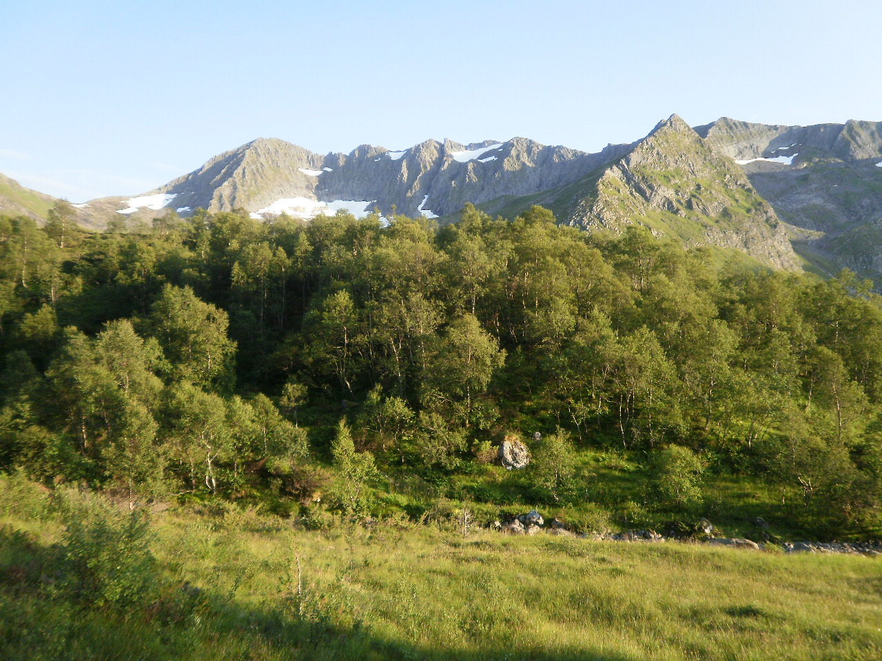 Kveldsstemning 25. juli, Åvasstinden, Fossholtinden og Middagshornet (det minste) i bakgrunnen.