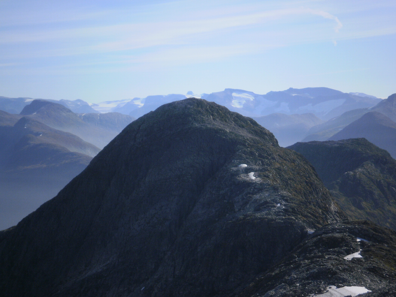 Eit stykke nedafor toppen. Zoomar søraustover. Lodalskåpa i bakgrunnen rett over den nære toppen. Skåla i bakgrunnen til høgre.