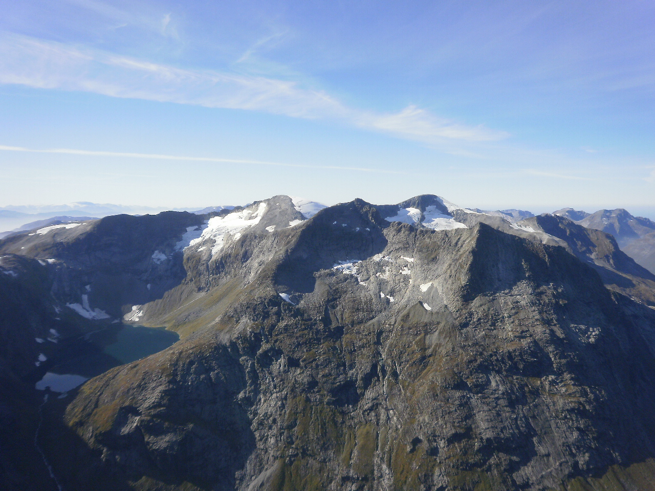 Oppe på toppen: Ser tvers over Tussevatnet mot Rokkekjerringa i midten og Storhornet til høgre.