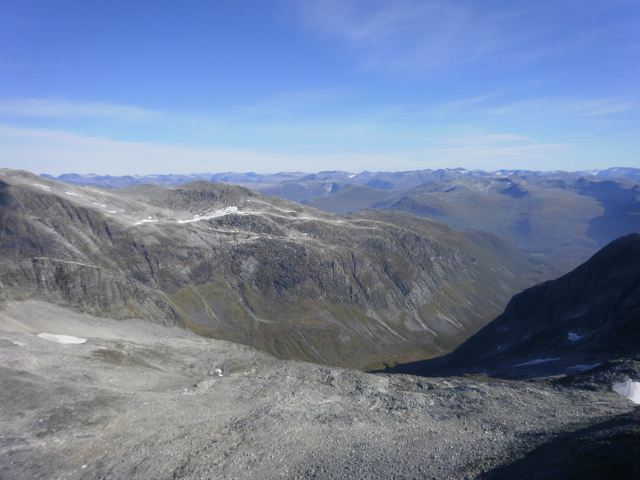 Ser austover ned i Kjellstaddalen. I det fjerne er Puttegga, Høgstolen, Karitinden, Naushornet og Torsnosa å sjå.