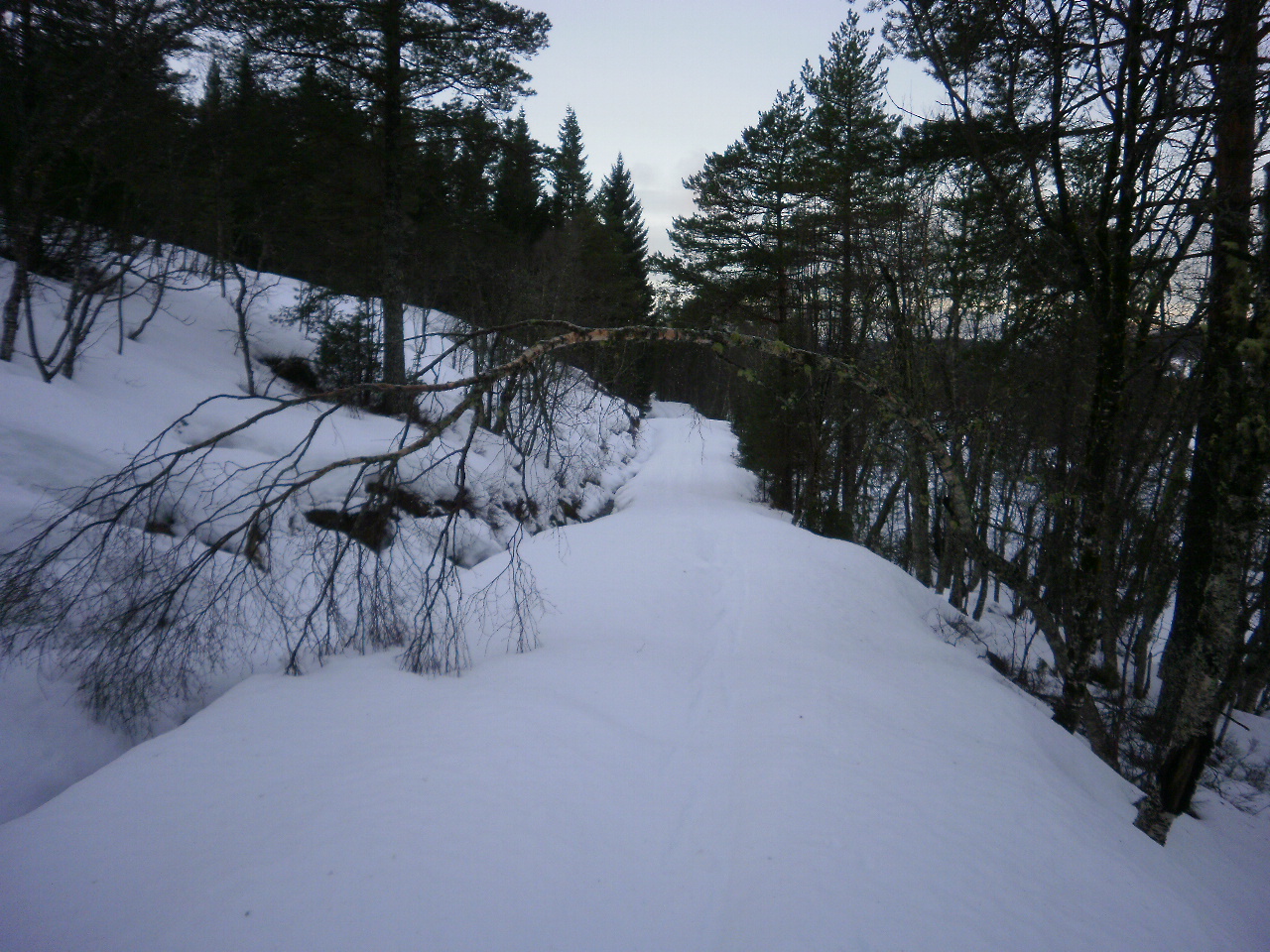 Høg og slank bjørk som har vorte bøygd av snøfalla i det siste. Skiføret her var ikkje heilt godt på nedturen, med skare som ga etter og ga lite styring.