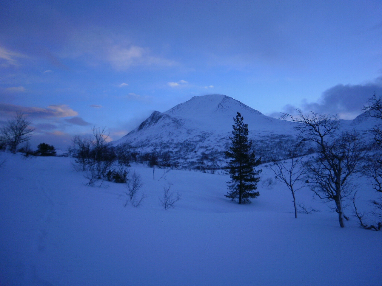 Bris frå sør, og innimellom er det rennefok. Skiføret lengre nede var godt i sporet frå ein snøskuter, men her fyk sporet att. Ser mot Kvitnykja.