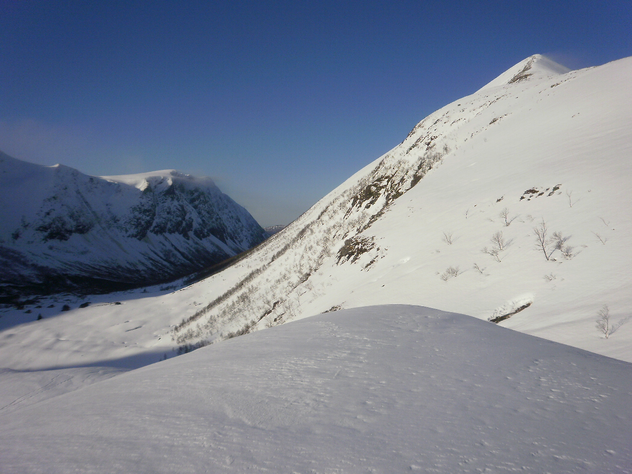 Stoppar på Hesteryggen. Her er det mindre vind enn oppe på Barstadskaret, der det bles kuling frå sør. Ser Trongegga til høgre og Årskogfjellet i bakgrunnen.