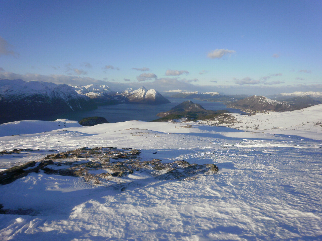 Bra skitur på skaren på kryss og tvers oppover. Men her oppe er vinden om lag sterk kuling frå sør-søraust. Berre å renne nedover til litt lunare lende.