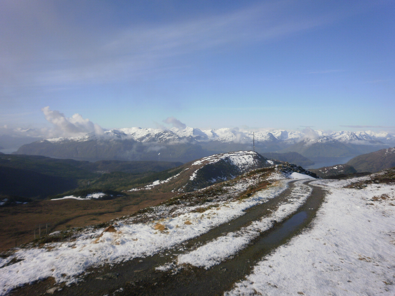 Ser sørover. Nysnø og svak vind frå søraust. Nede i lia her gol gauken eit kvarter etter dette.