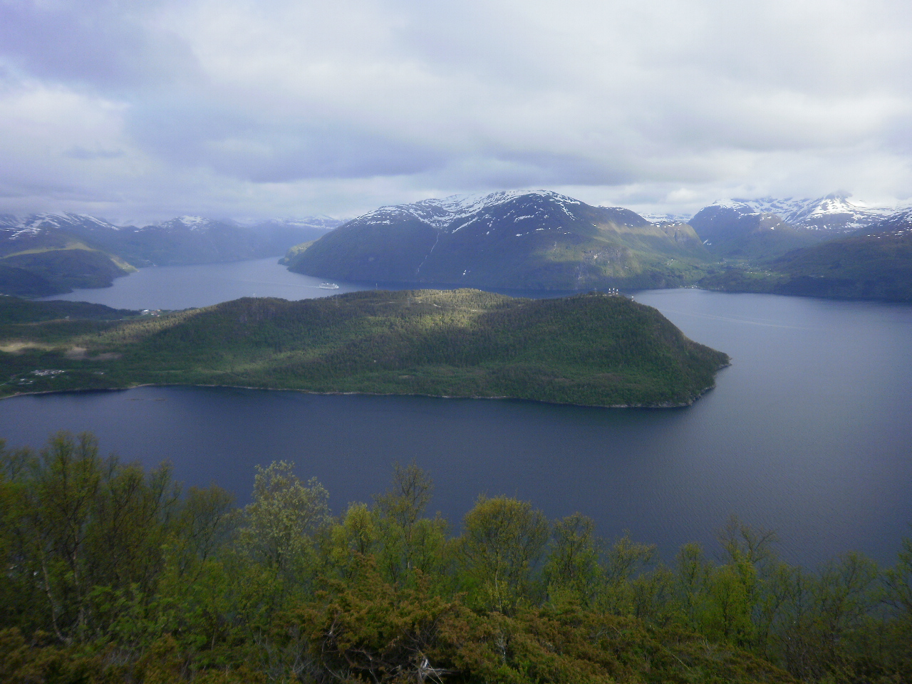 Ørskogvika nedunder, og Storfjorden både til høgre og innover i bakgrunnen. Gausneset til høgre midt oppe i bildet. Vest lett bris og kjølig i lufta. Stort sett opplett denne kvelden.