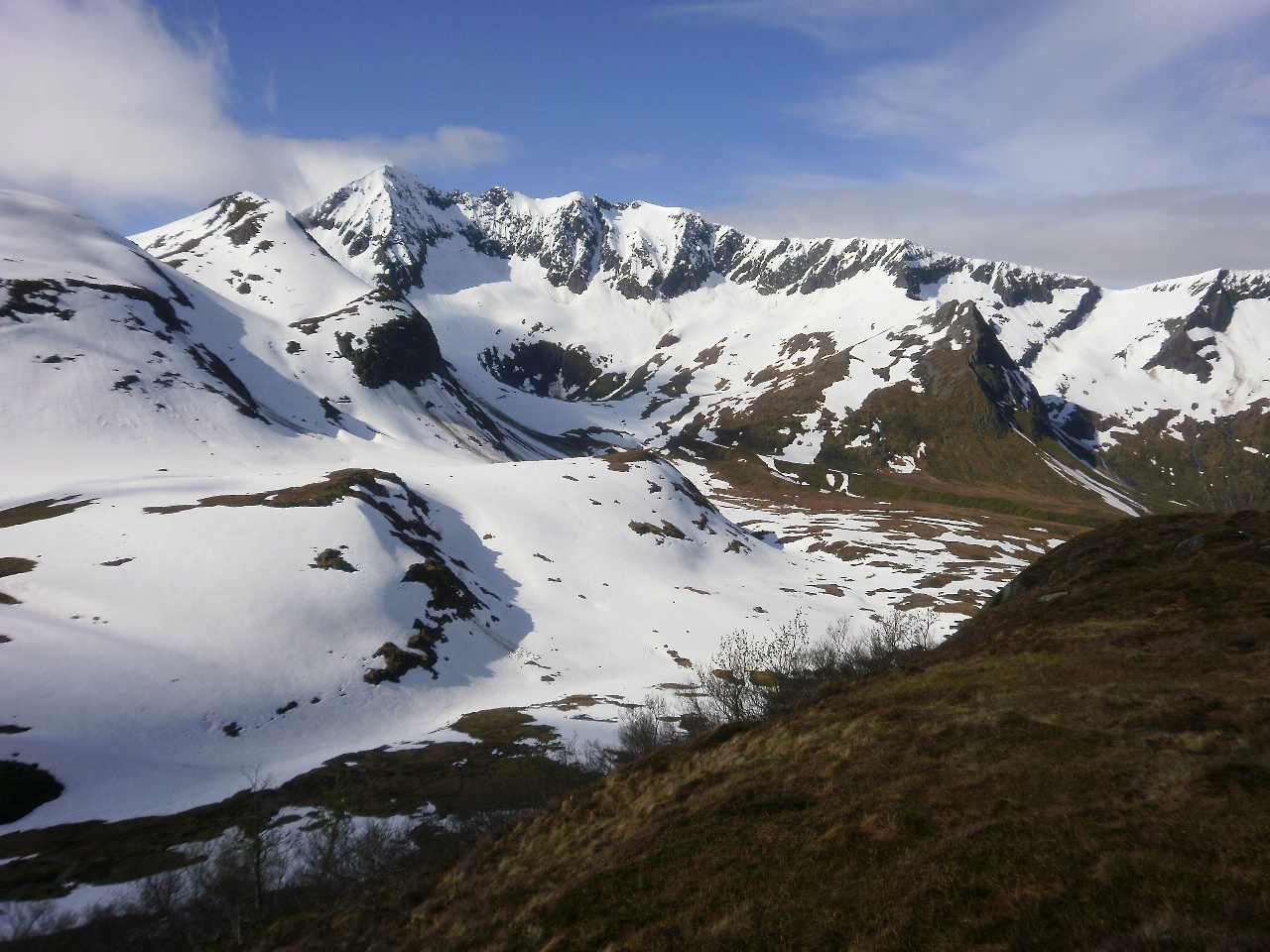 Ser mot Åvasstinden og Fossholtinden i bakgrunnen. Mykje snø i fjella.