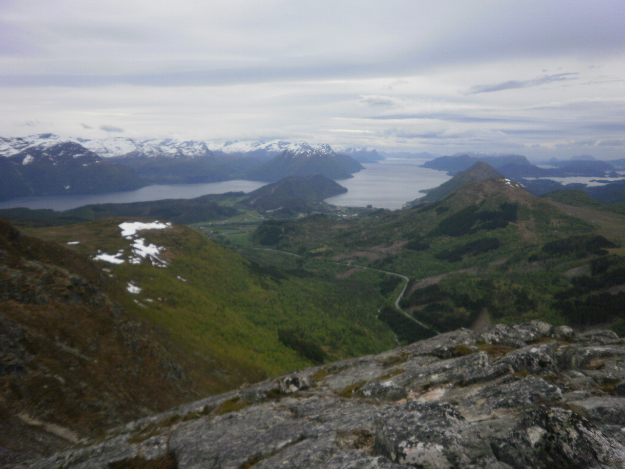 Vêret tjuknar til. Liten kuling frå sør på toppen, men det er lunare straks nedom. Ser mot Storfjorden og Ørskogbygda. Vêrhornet og Liafjellett går i eitt til høgre.