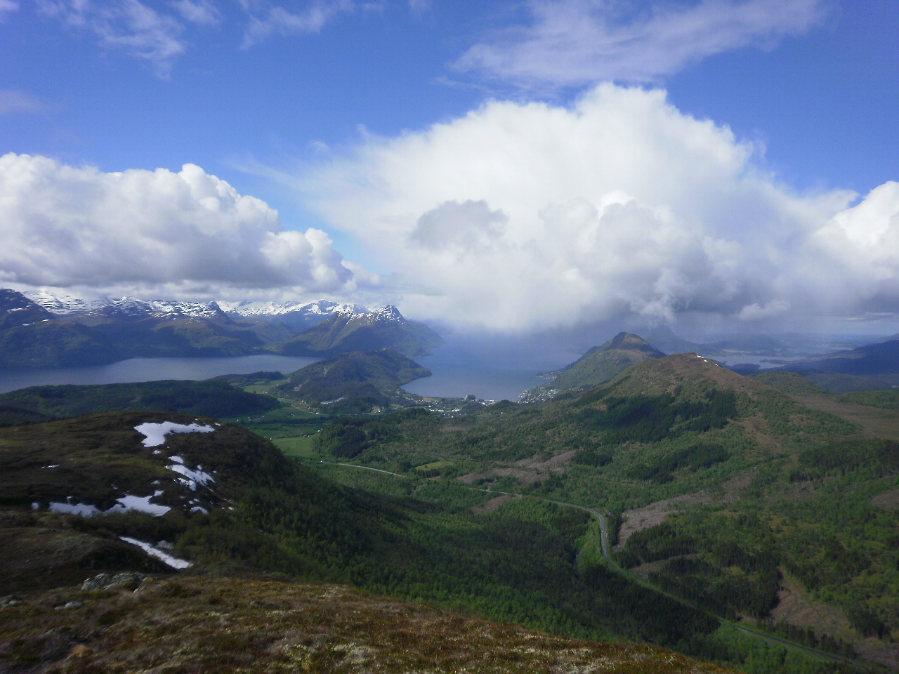 Utsyn litt vest for Giskemonibba. Sørvest laber bris og kjølig på toppen. Ei byesky ruvar i bildet, men dagen vart bra med ein del sol. Ørskogvika midt i bildet.