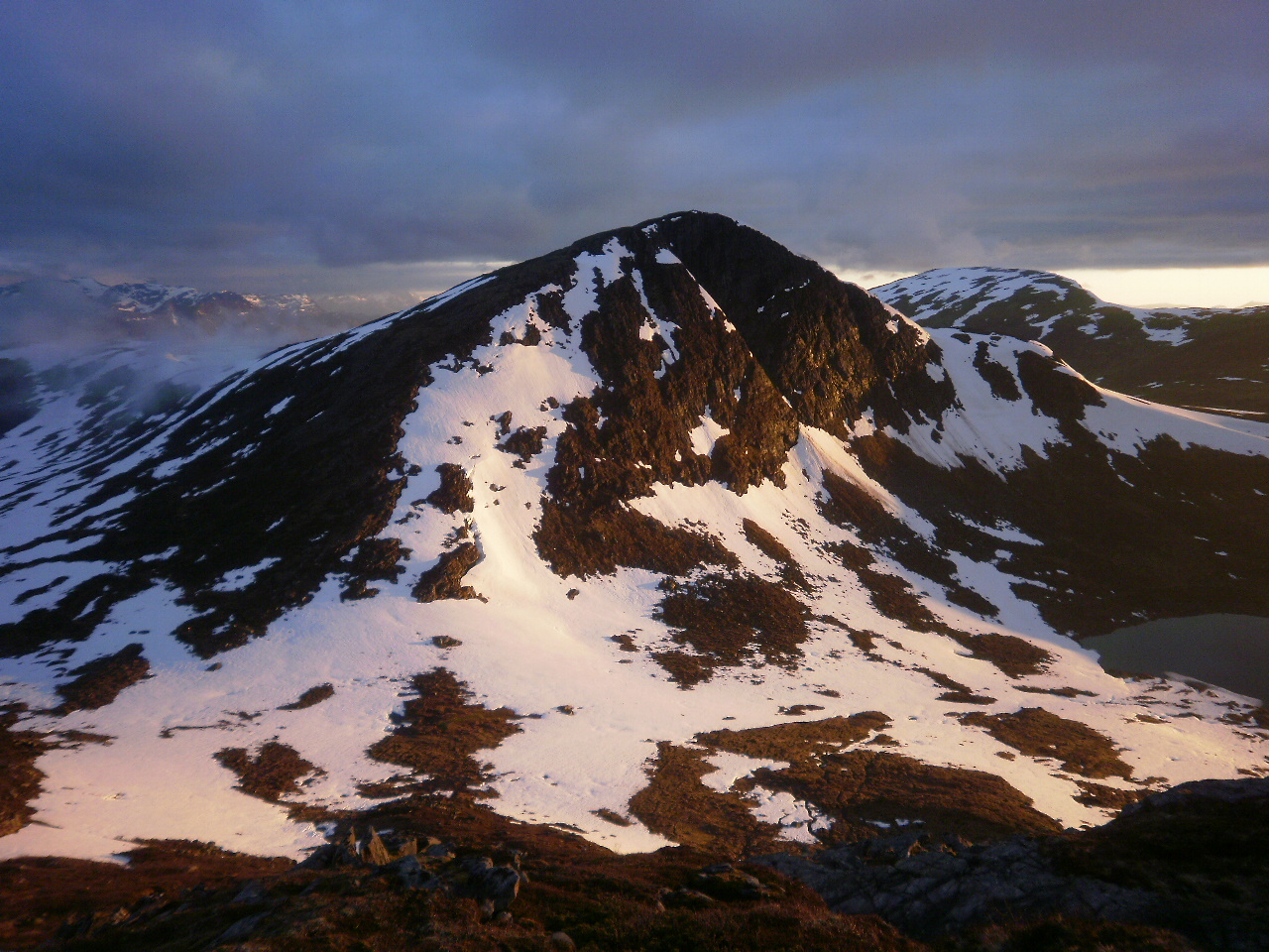 Kl. 23. Snart nede på reset i Kvanndalen. Ser bort på Geitnibba.