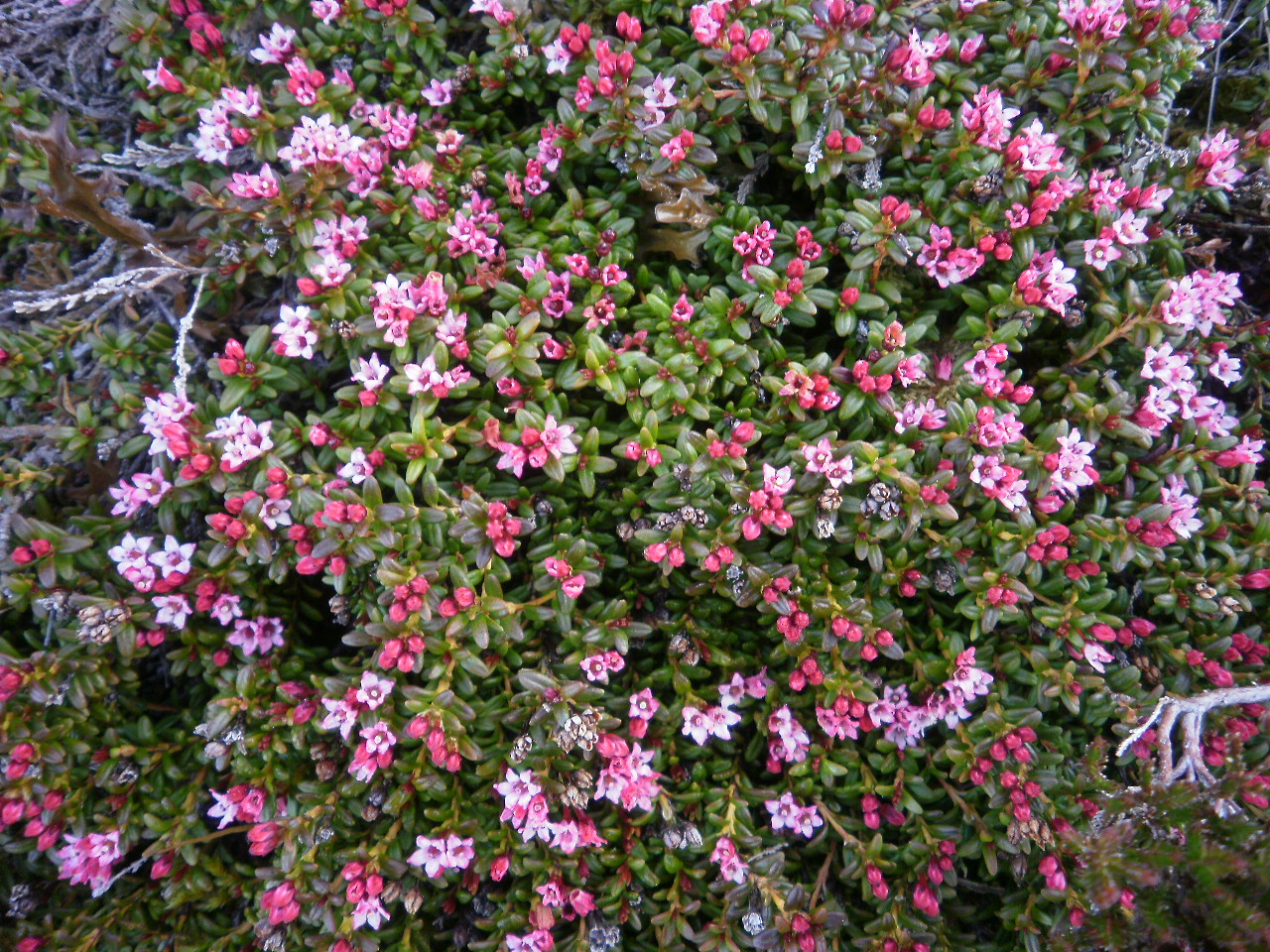 Komen opp om tregrensa. Greplyngen blomstrar på rabbar med lite snødekke, og er tidlegare ute enn dei fleste fjellblomstrane.