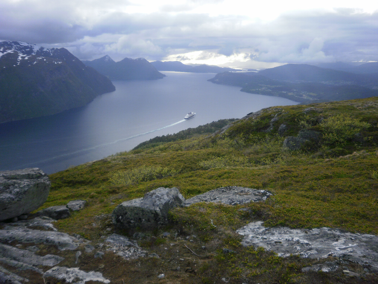 Kveld, og turistbåtane dreg utover. Her har hurtigruta passert. Kjølig i lufta oppe på toppen, med ein vest-nordvestleg laber bris.