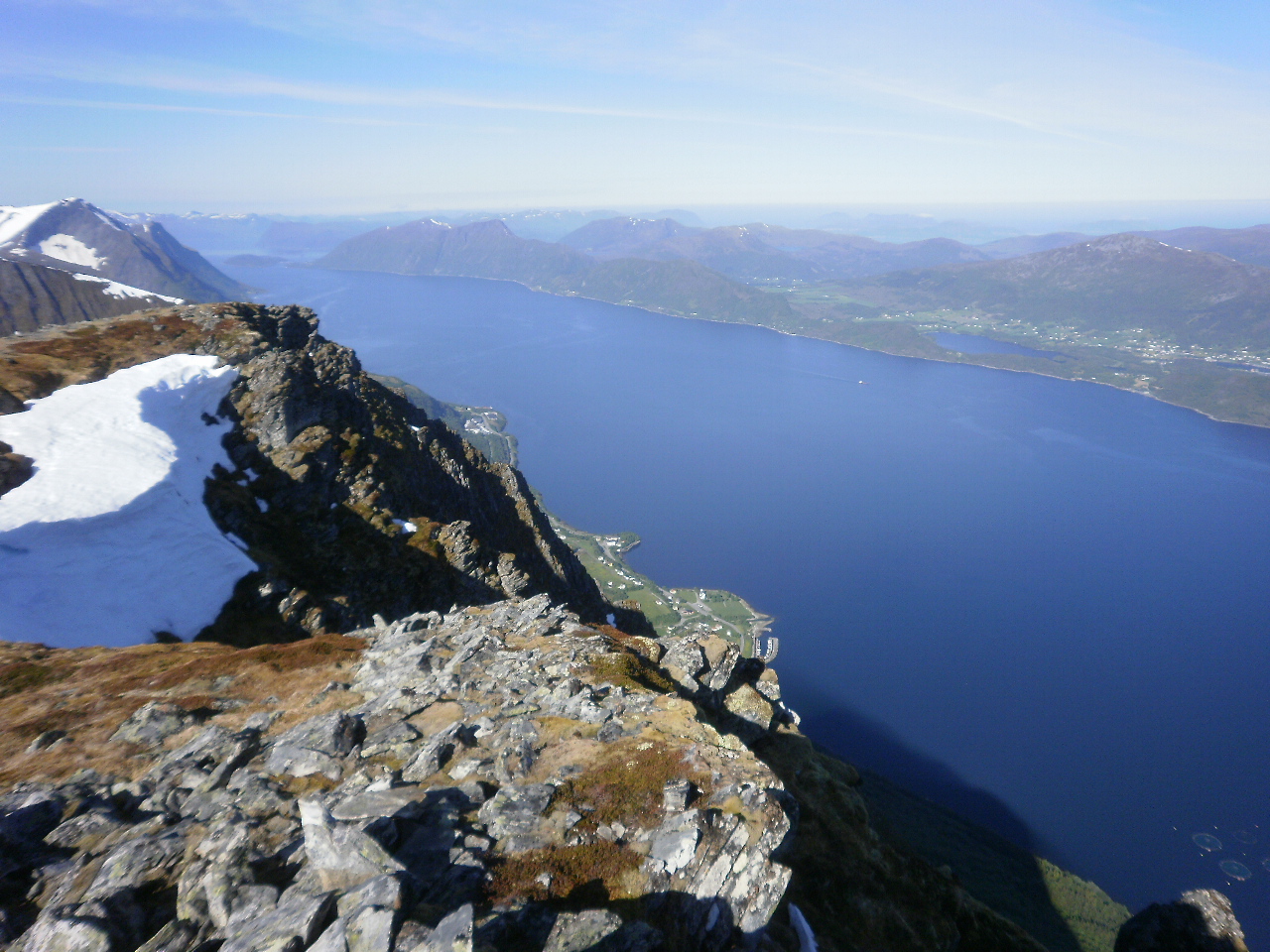 Ser mot vest, og nesten heile Vartdalsfjorden. Litt av Nordre Vartdal stikk fram. Bergehornet til venstre og Melshornet til høgre.
