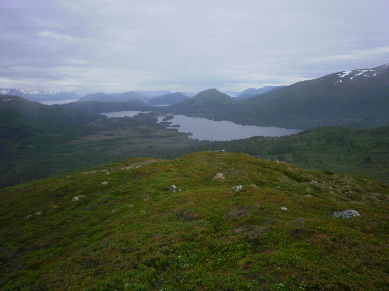 Ser mot Svartløkvatnet og Mevatnet. Svak vind frå nord og mildt i lufta. Opplett på denne turen.
