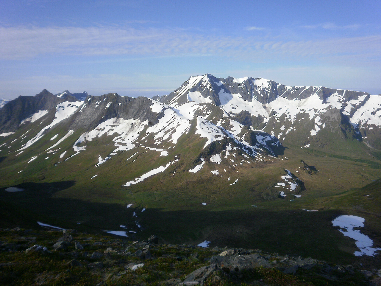 Fint oppe i høgda denne morgonen. Svak vind frå aust eller søraust, og høg lufttemperatur. Ser mot Åvasstinden og Fossholtinden litt til høgre. Til venstre m.a. Høgehornet og Kjerringa.