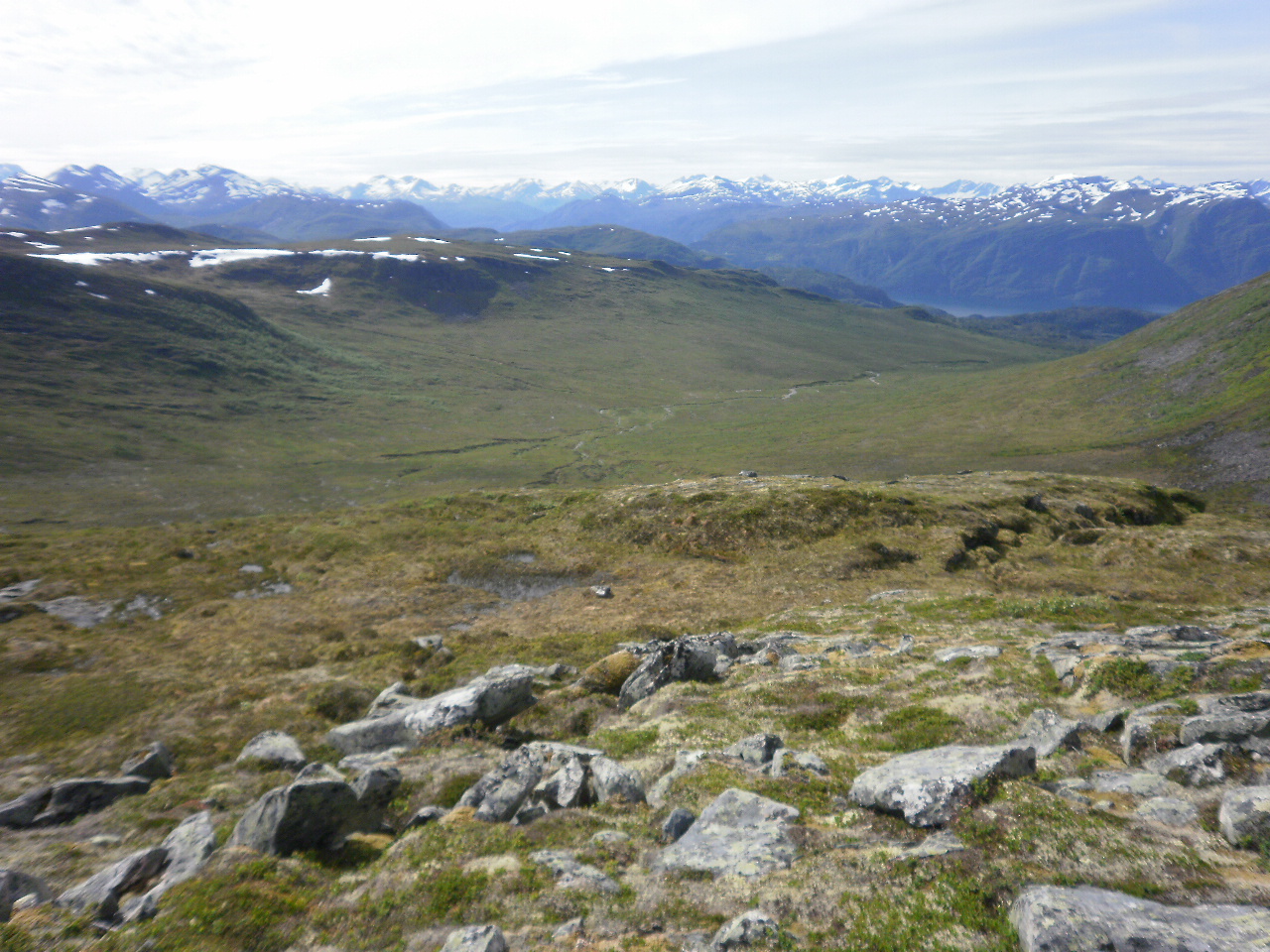 Ser frå Koldafjellet ned i Skarbøbotnen. Fjella i Stranda og Sykkylven i bakgrunnen.