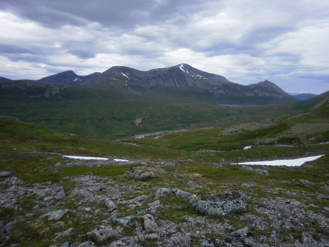 Ser nordover med Sprovstinden litt til høgre, og Brustinden/Trolltinden til venstre og lengre borte i bakgrunnen.