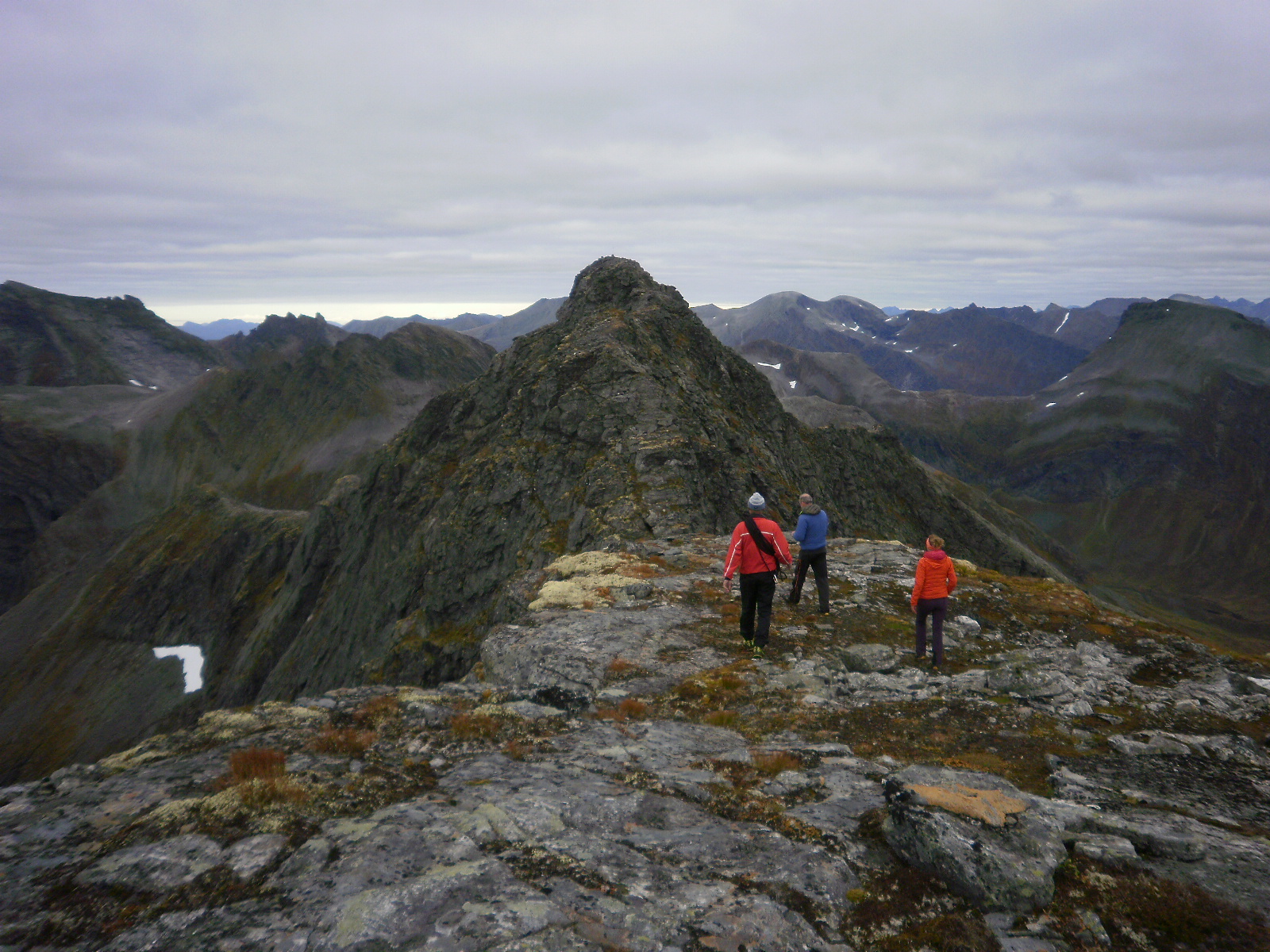 Går ned frå vesttoppen her. Ser bort på høgaste toppen. Rolege vindtilhøve i dag.