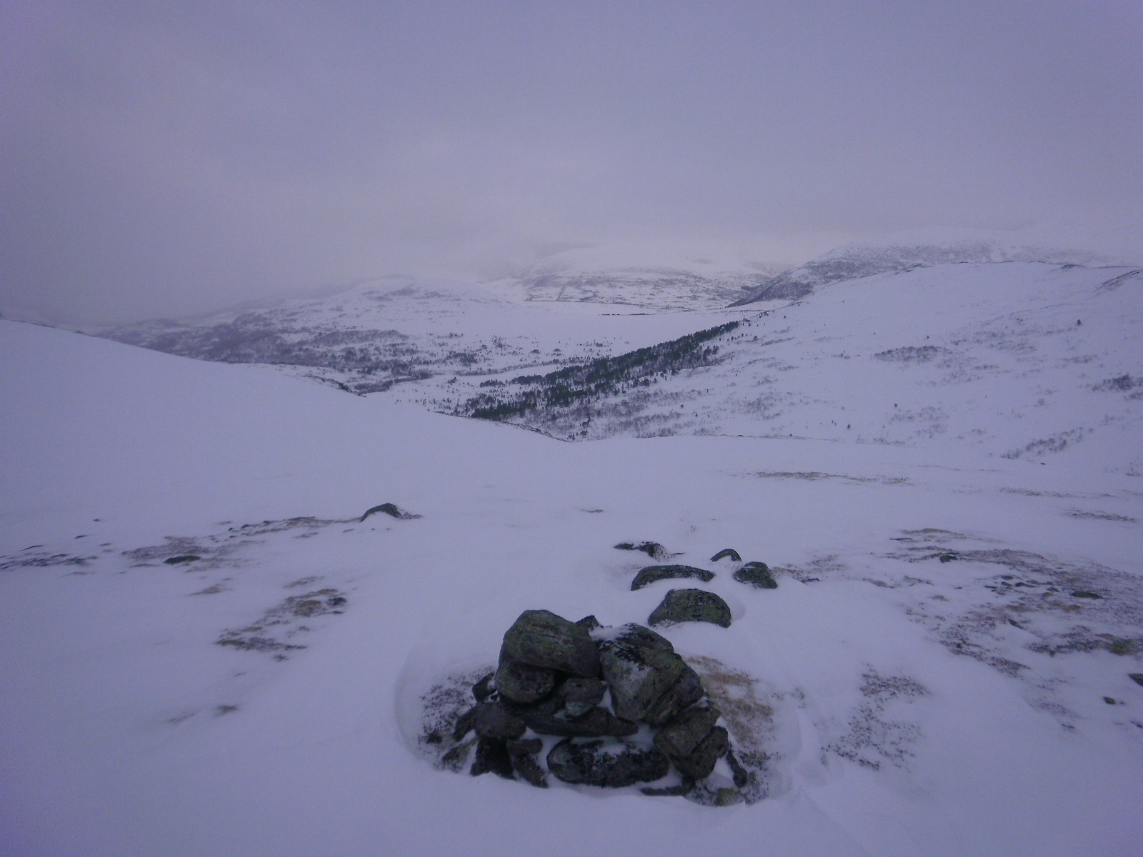 3. februar: Gjekk opp att spora frå i går før dei snøa att. Er her komen opp i skaret mellom Skarbøbotnen og Kvanndalen. Mildare enn i går. Bles lett bris frå sør eller søraust her oppe. Lunt i Skarbøbotnen. Ser mot nord.