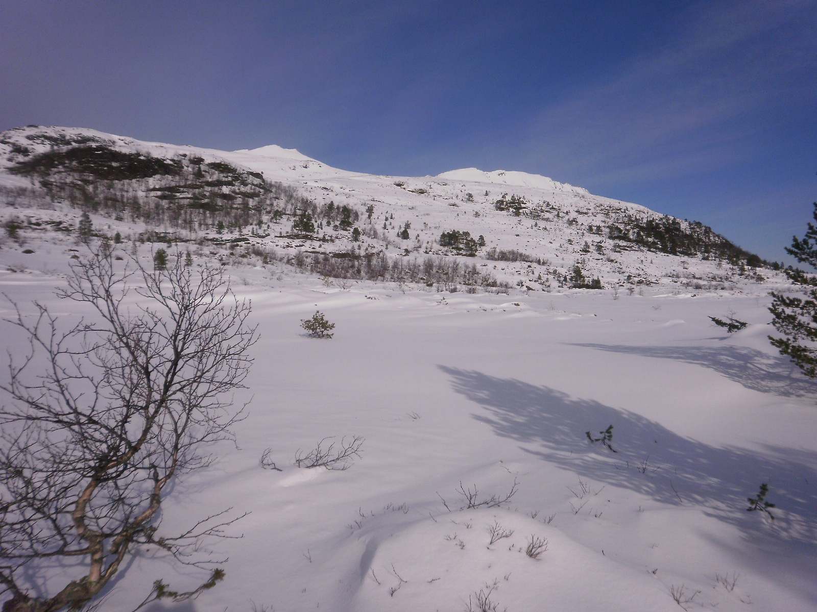 19. mars: Ettermiddag og snart slutt på solskinet. På fjella rauk snøen av aukande synnjavind, og i sør skya det til på dette tidspunktet. Ser opp mot Åsrørene med Høgsvora og Næremstindan stikkande opp bakafor.