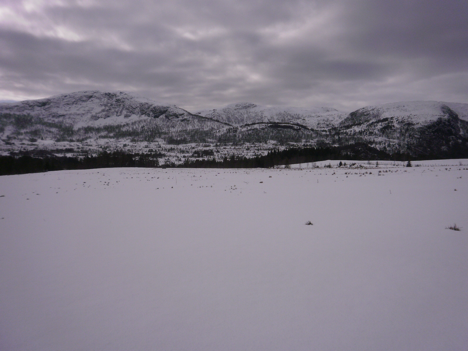 25. mars: Vegen var ikkje snøfri på skuggestadane, men det gjekk an å kome seg hit. Skya til etter nokre timar med sol. Ser mot Bolleberget og Visetbotn.
