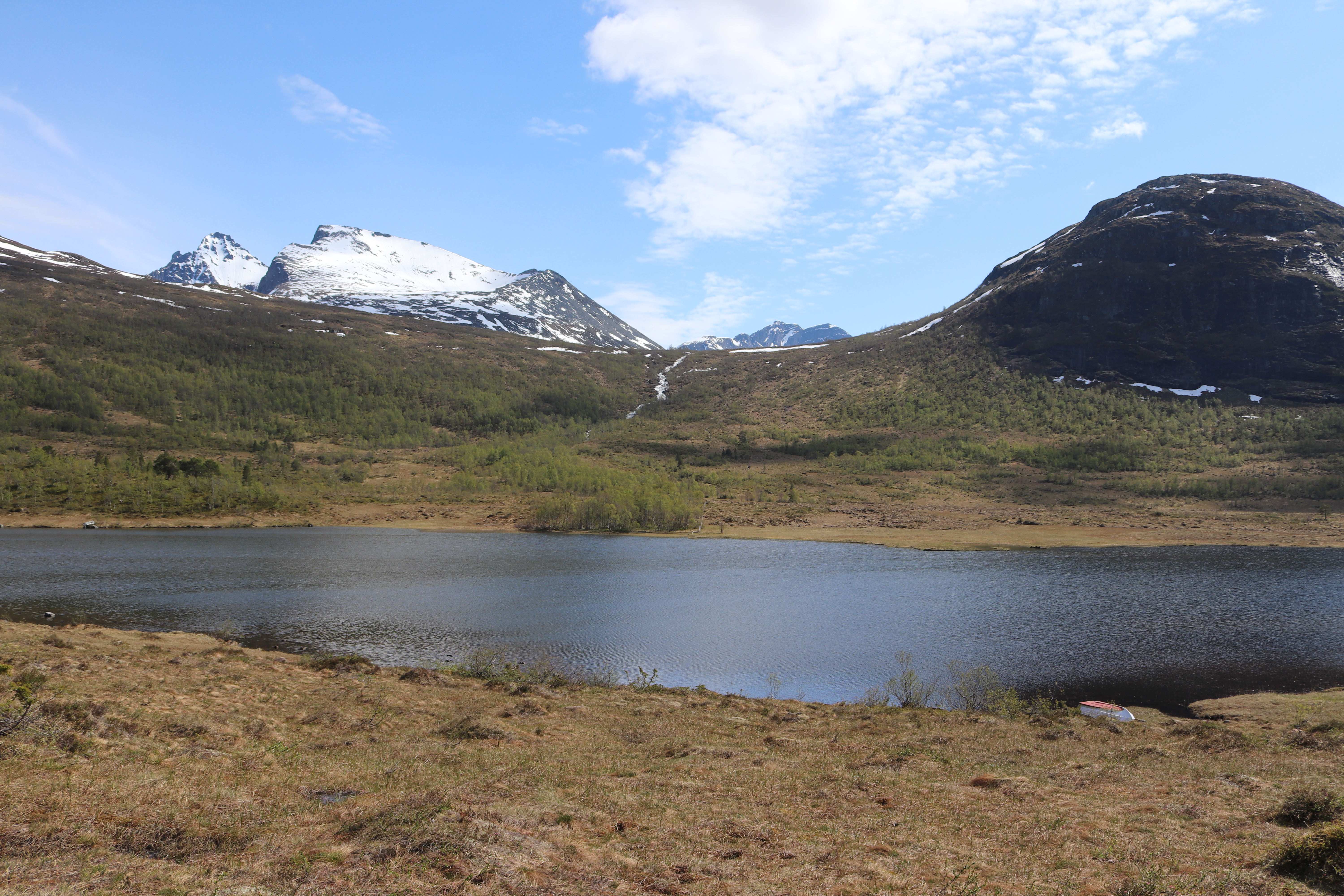 19. mai: På tilbaketuren. Vart fint med sol i dag. Ser mot Blåfjellet til høgre, Lauparlægda og Lauparen til venstre, og Storbotnshornet stikkande opp bak. Høyrde gauken for første gong i år i lia bortom Kjersemvatnet.