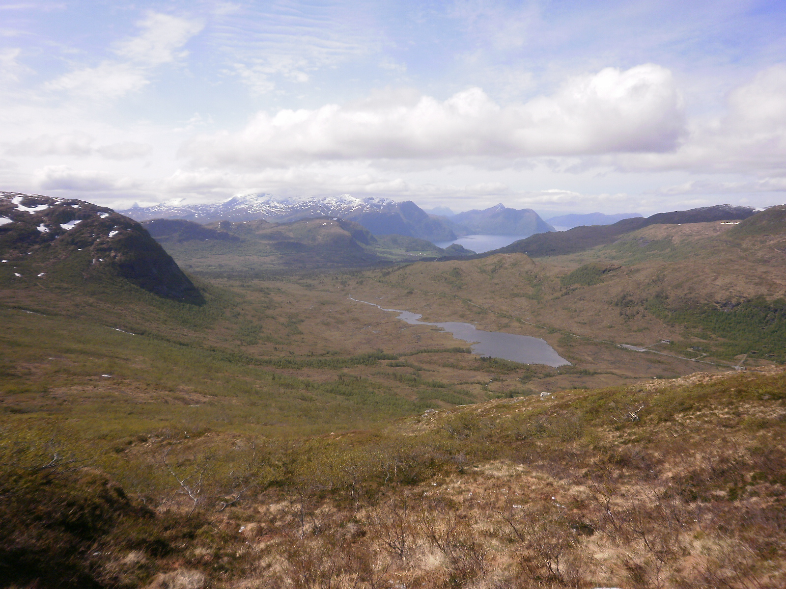 Komen langt nedover. Kjersemvatnet midt i bildet, og Blåfjellet til venstre.