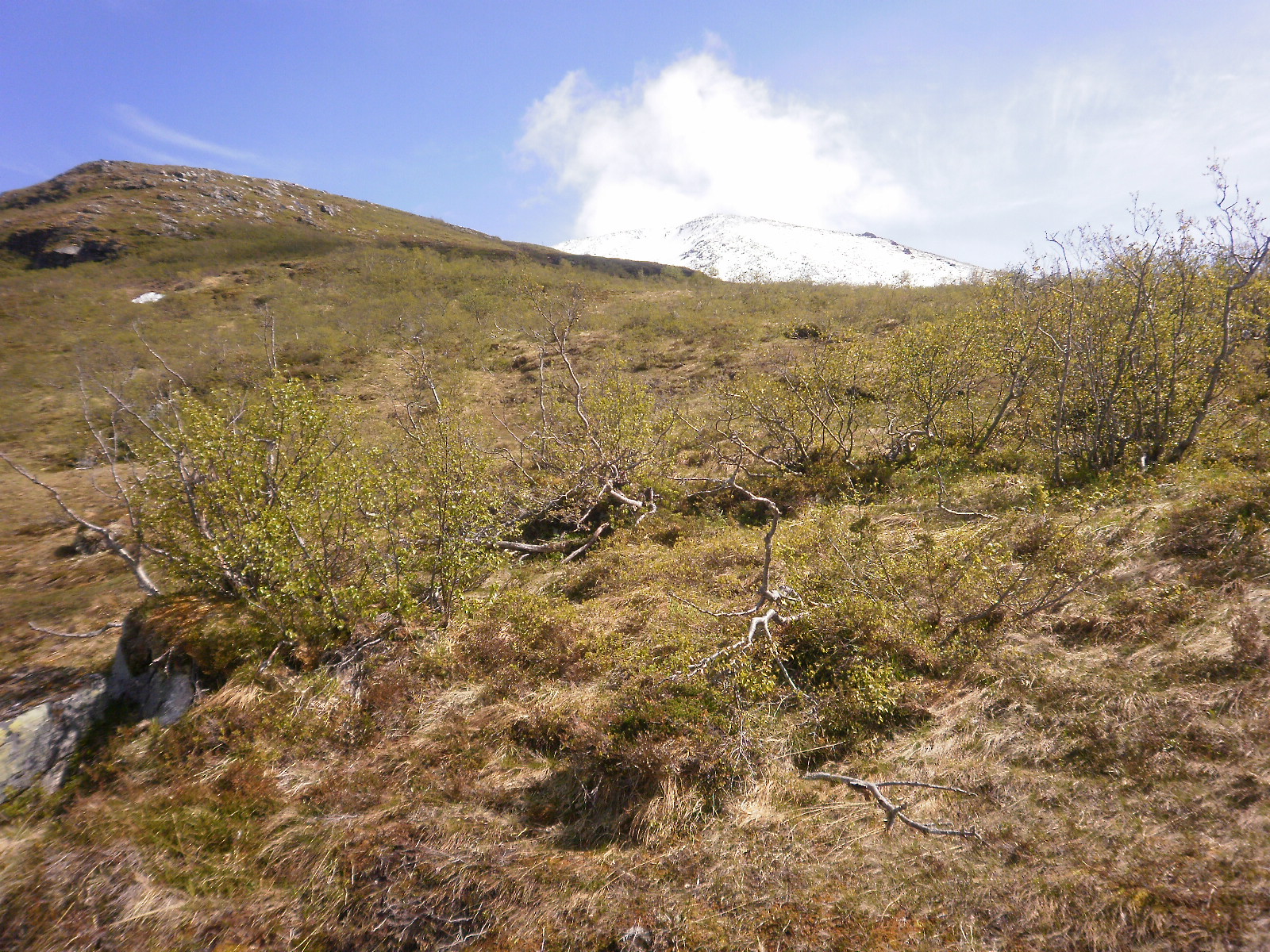 Ser tilbake oppover. Kvitnykja med snø på stikkande opp til høgre.
