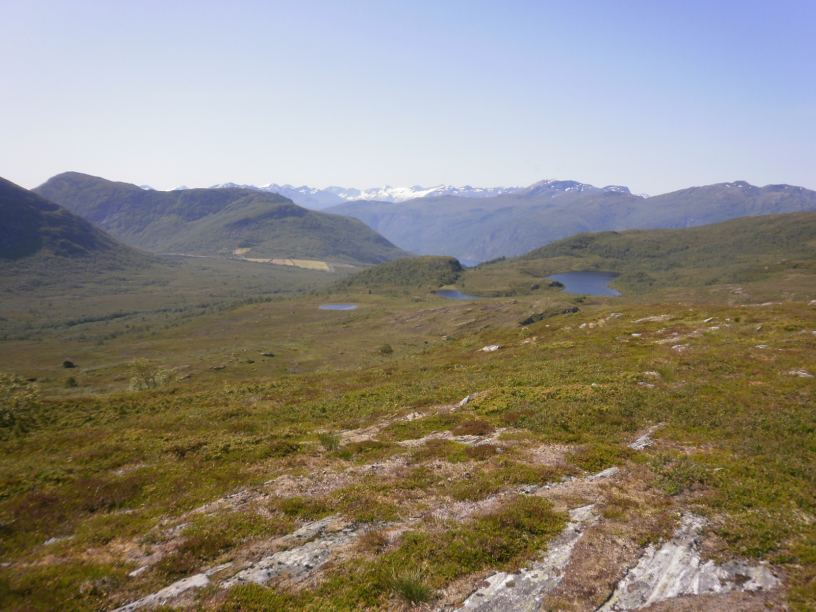 12. juli: Fin solskinsdag med utrøne, lett bris frå nordvest, ute på kanten. Her på denne sida er det lunare. Ser mot sørvest, med Dyrkorn gøymd nede i dalen nedafor, og fjella i Sykkylven med snø på i bakgrunnen.