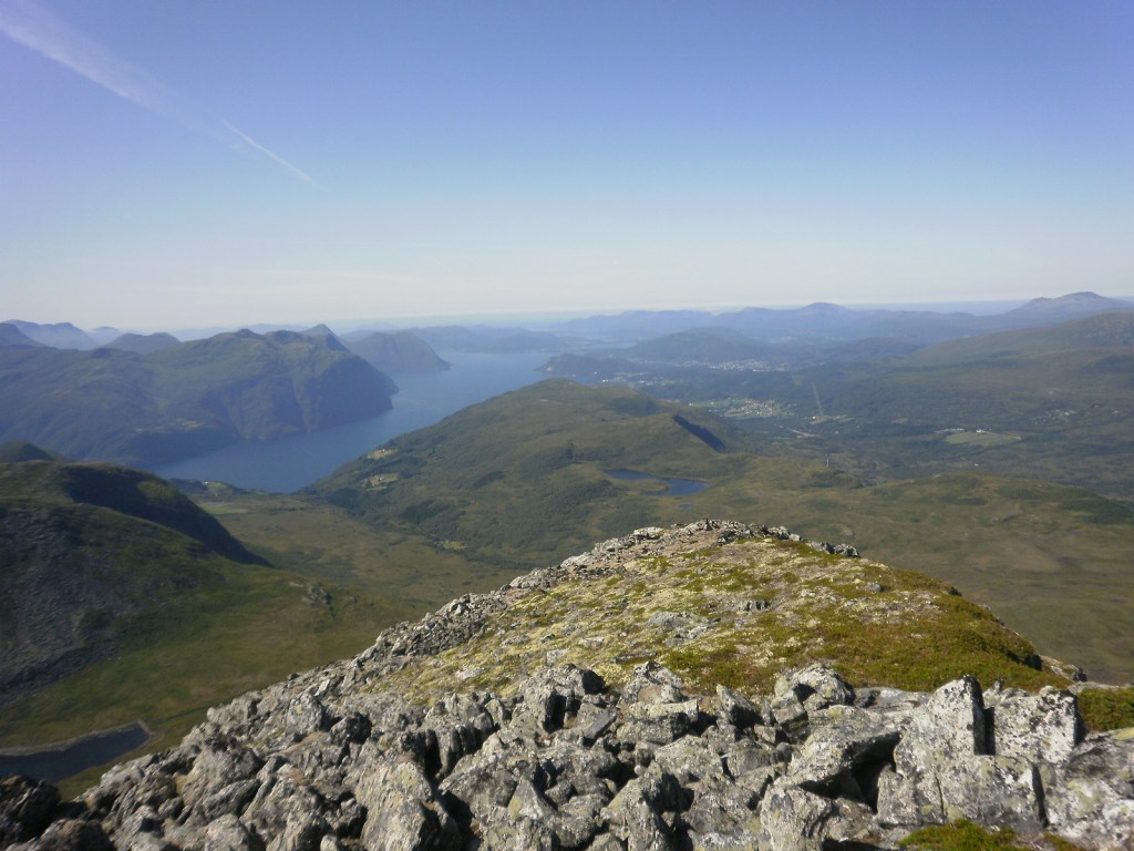 4. august 2019: Ser mot vest med Hallvardfjellet midt i bildet. Pluss atten grader og sør-sørvest svak vind her oppe.