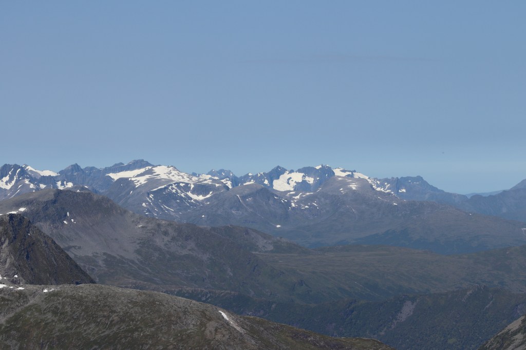 Brunstadhornet, Urkedalstinden,Midtre Regndalstinden, Hjelledalstinden, Råna, Ramoen, Blåbretindane og Hundatinden.